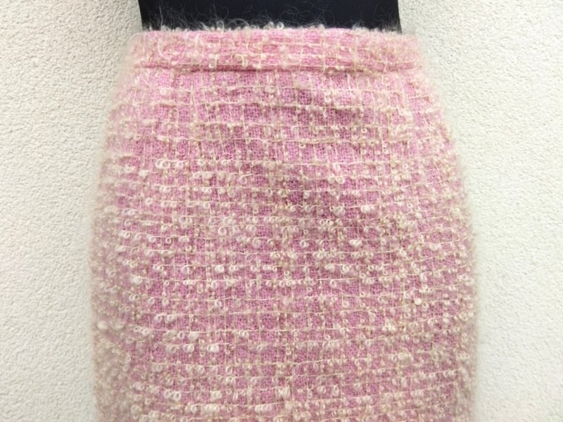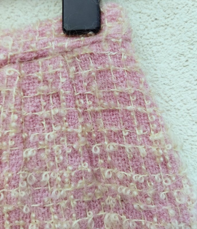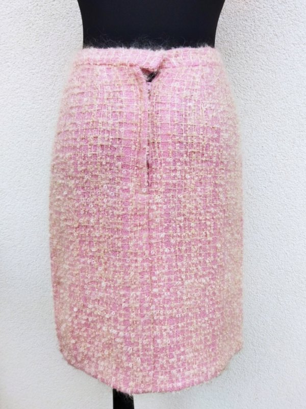 Ciepła ołówkowa spódniczka z wełnianej tkaniny w różowym kolorze przetykanej włóczką z fakturą boucle w kolorze mlecznej bieli. Na pasku w talii,. zapinana z tyłu na zamek . Na bawełnianej podszewce.