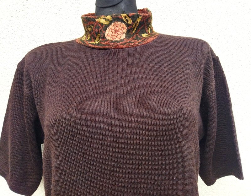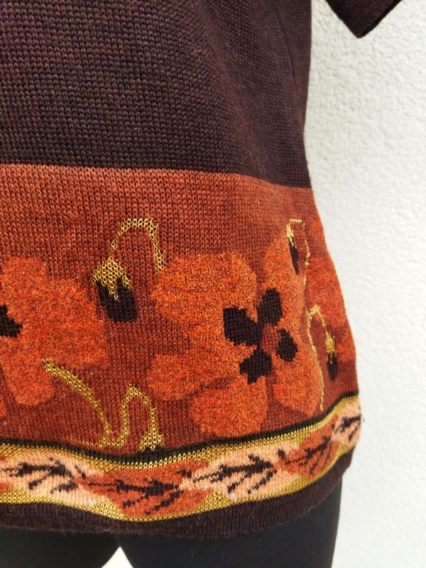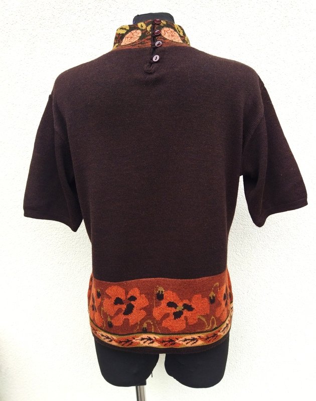 Piękny żakardowej dobrej jakości sweter z dużym udziałem wełny , w kolorze gorzkiej czekolady z kwiatowym wzorami w jesiennych barwach odcieni brązów, rudości, rozbielonej zielni, moreli i czerni. z półgolfem , zapinany na plecach na guziczki.