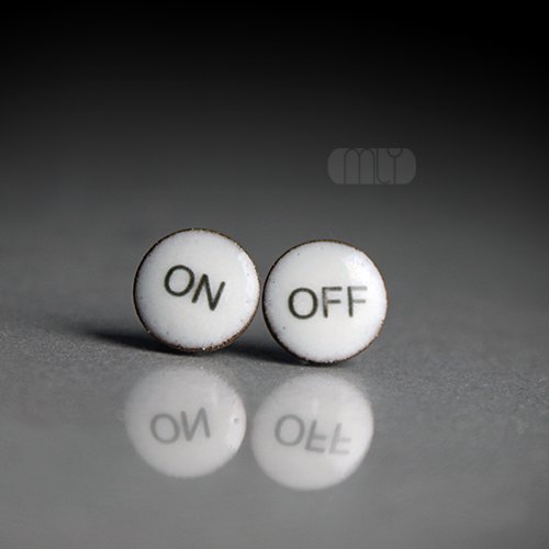 Ceramiczne okrągłe kolczyki, ręcznie wykonane z delikatnej gliny kamionkowej, jednostronnie szkliwione mieszanką białokremowych szkliw z efektem plamek, dekorowane kalką ceramiczną w kolorze czarnym,na sztyftach w kolorze srebrnym. Średnica ok.11mm. Polecam