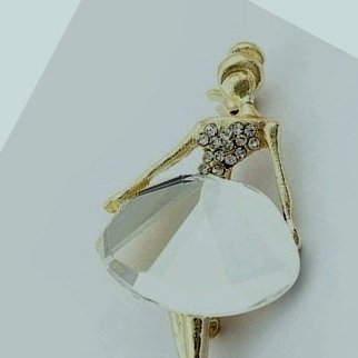 Śliczna broszka - baletnica. Jej spódniczka wykonana jest z jednego kryształka, w którym ślicznie załamuje się światło. Zyskuje w kontakcie w cztery oczy;) ma ok 4,5 cm i wygodne zapięcie
