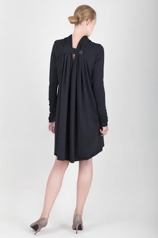 dekolt szalowy, półgolfowy z przodu, z tyłu puszczony i zebrany patką z guzikiem, rękawy długie, wąskie, do przymarszczenia