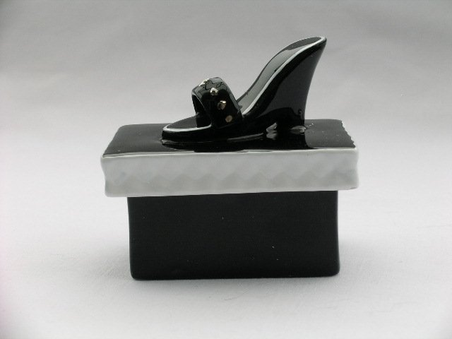 Bardzo ciekawe,nowe puzderko - pudełeczko. Ciekawa przykrywka z eleganckim butem; boki ryflowane.Całość na błyszcząco szkliwiona tylko w czerni i bieli ze szczyptą srebra. W oryginalnym pudełku. Russ Berrie & Co. UK.