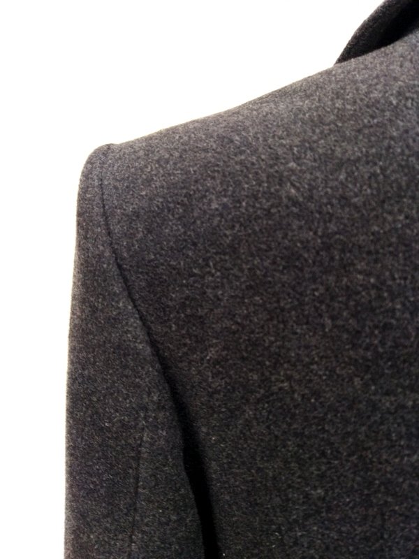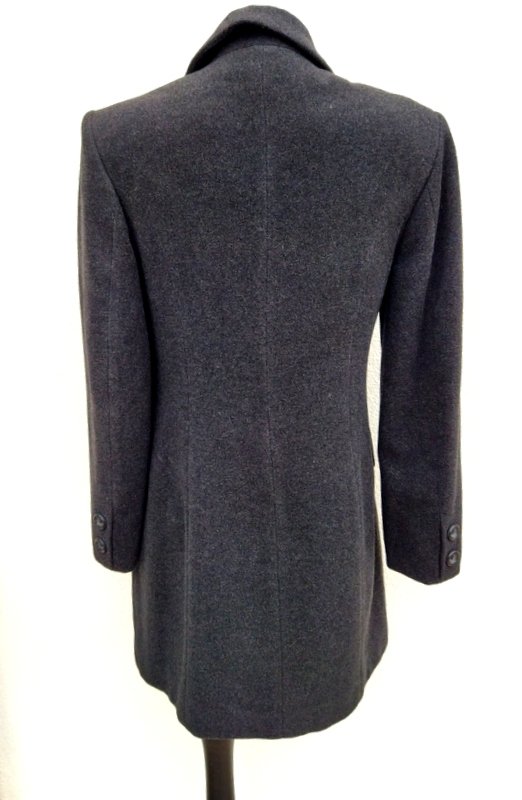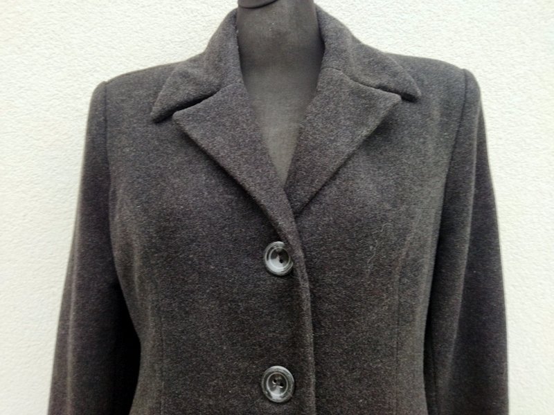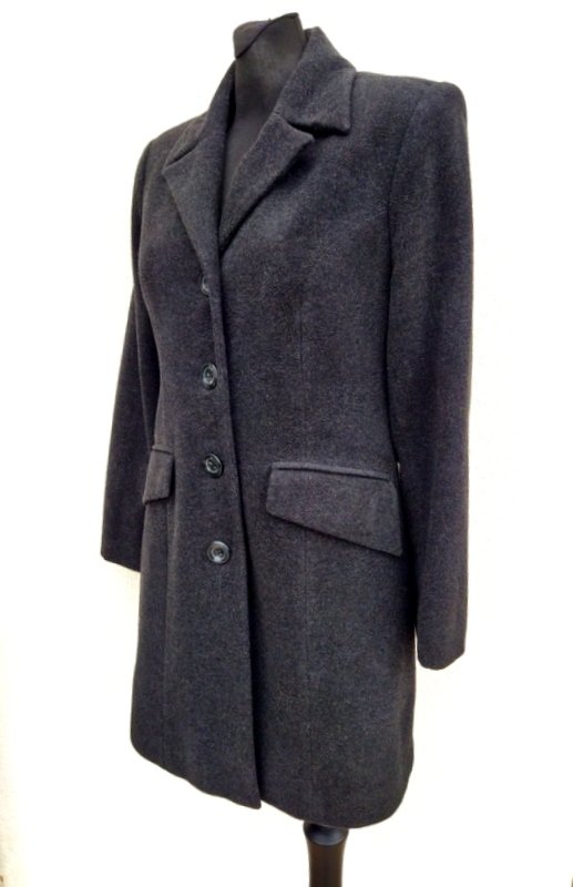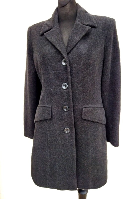 Zgrabny dobrej jakości płaszcz w kolorze grafitowej czerni. Taliowany, z kołnierzem z rewersami , z dwiema wpuszczanymi kieszeniami. Zapinany na guziki. Całość na podszewce