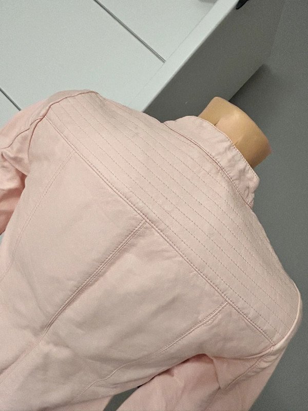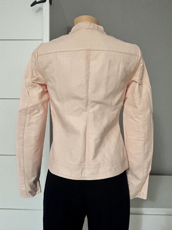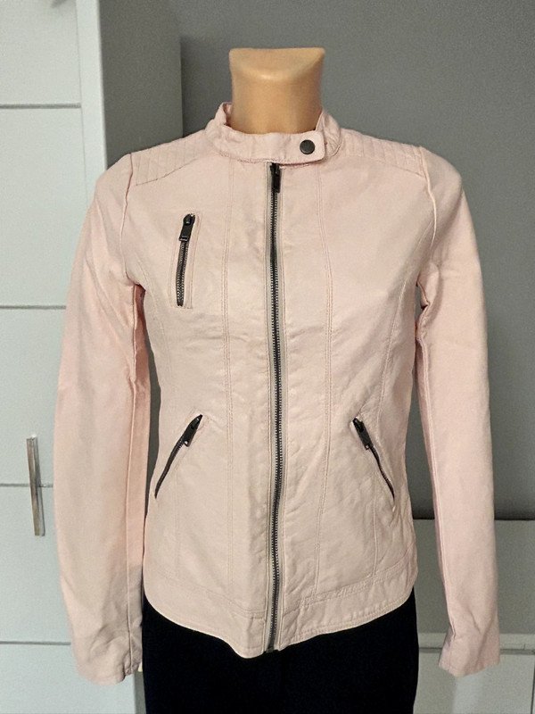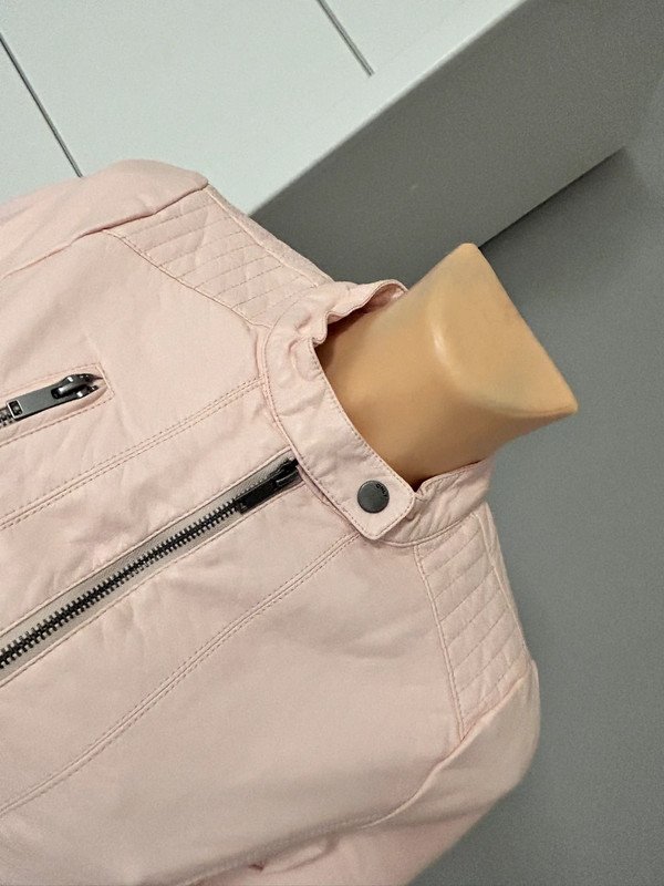 Różowa pudrowa kurtka marki only, rozmiar z metki to XS 34. Jest wykonana w 50% z wiskozy. Kurtka w stylu motocyklówki albo ramoneski. Wykonana ze sztucznej skóry. Na końcu pokazałam minimalną wadę, lekkie zabarwienie, które nie rzuca się podczas użytkowania wolałam o tym wspomnieć.
