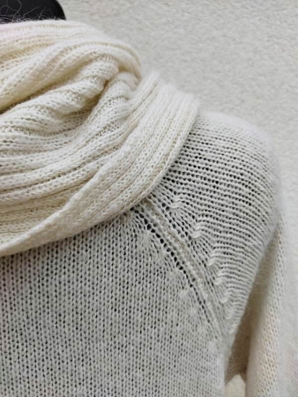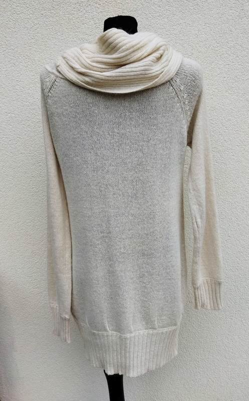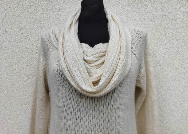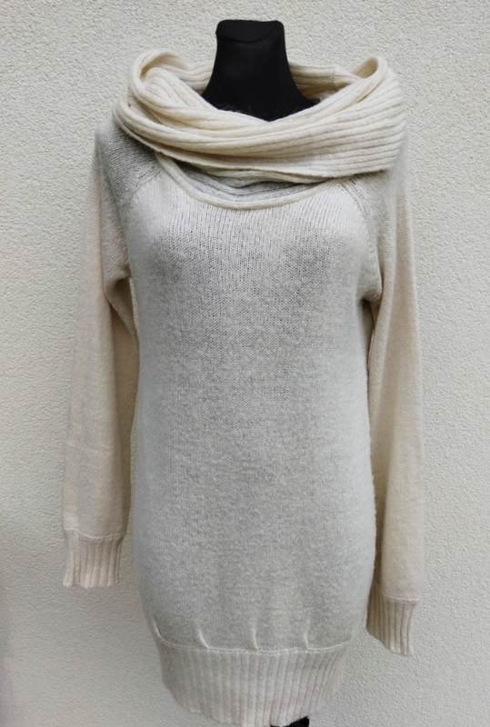 Dłuższy sweter lub sukienka z akrylowej włóczki z alpaką , w kolorze złamanej bieli. Z olbrzymim luźnym golfem , który można dowolnie formować, z raglanowymi rękawami. Wykończony ściągaczami. Miły, miękki i lekki.