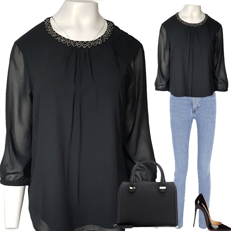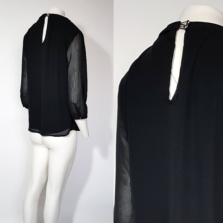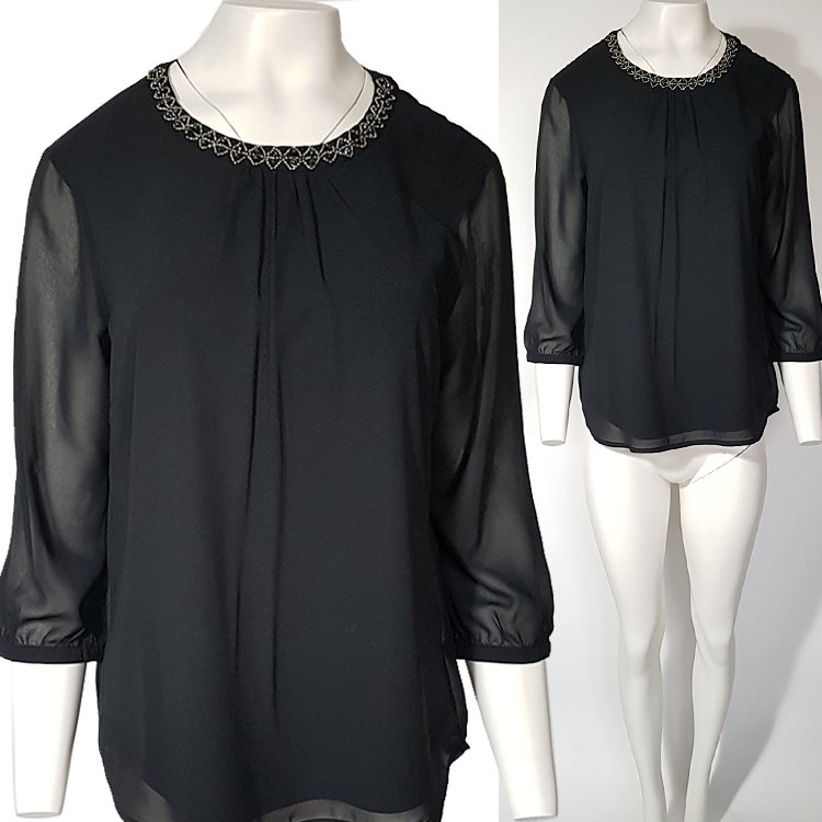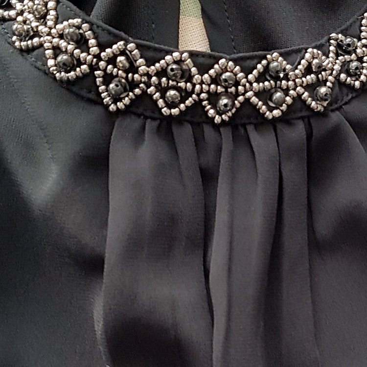 Elegancka bluzka z okrągłym dekoltem obszytym kralikami, na środku marszczona, rękawy 3/4 zakończone wąskim mankietem na guzik. Z tyłu przy szyi zapięcie na dwa guziczki. Korpus na podszewce.