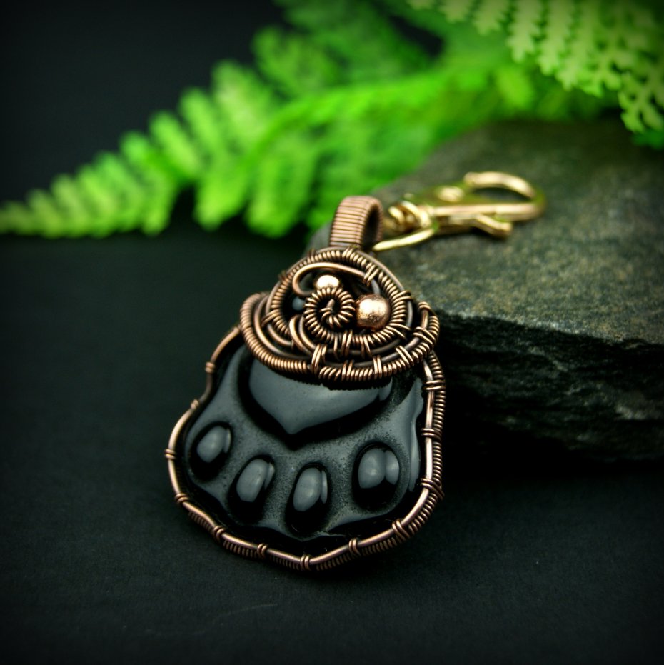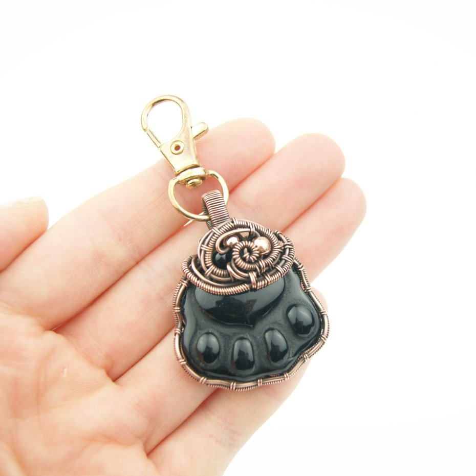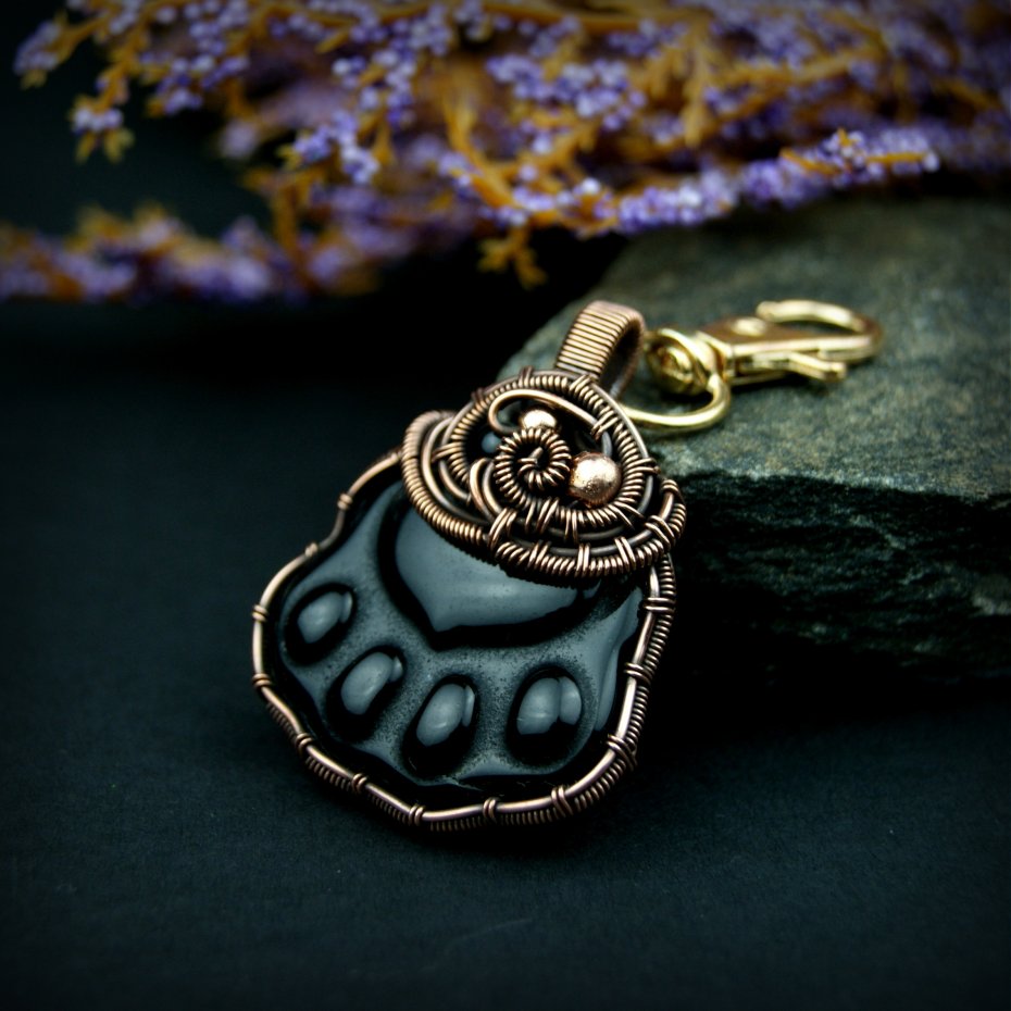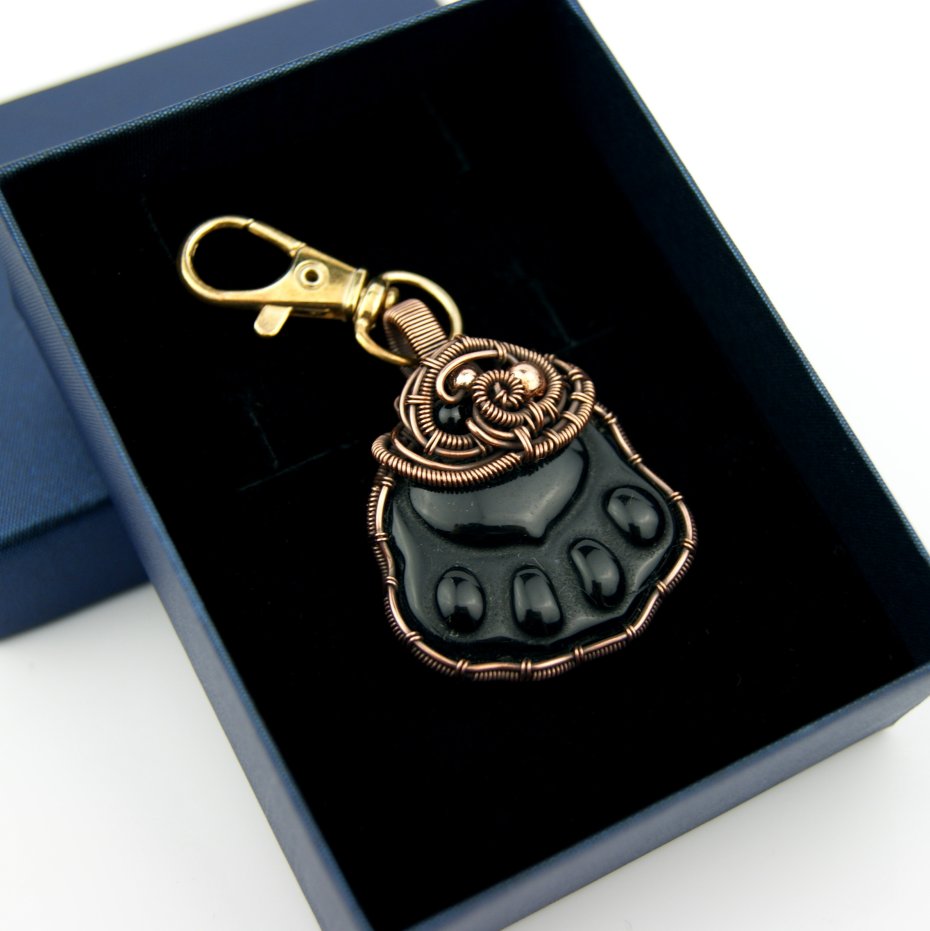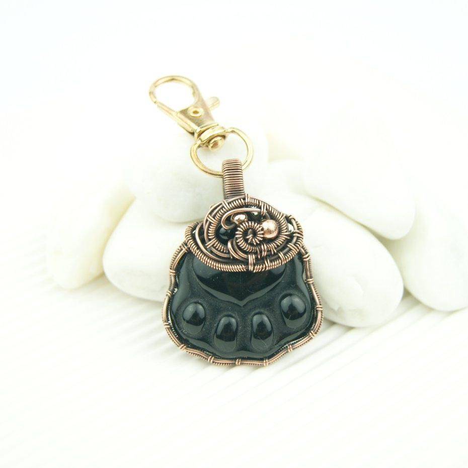 Brelok jedyny w swoim rodzaju, wykonany w pracochłonnej technice wire wrapping. Podstawę breloka stanowi kamień onyksu rzeźbiony w kształt psiej/ kociej łapki. Kamień wzbogacony misternym oplotem z miedzi. Idealny na prezent dla miłośników psów i kotów.