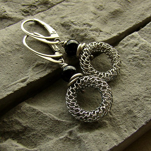 Kobiece i oryginalne kolczyki na co dzień i nie tylko. Wykonane w całości z oksydowanego srebra próby 925 oraz kulek czarnego onyksu wielkości 6 mm. Wielkość plecionych wianuszków to 1,6 cm. Całkowita długość kolczyków to ok. 4,5 cm. W mojej galerii naszyjnik do kompletu. Ozdobnie zapakowane.