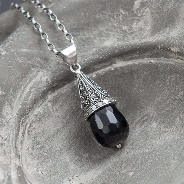 Fasetowana kropla onyksu ubrana w pięknie zdobione srebro bali. Wielkość wisiorka 30x12mm. Długość wisiorka 4,0 cm. Elementy wykończeniowe srebrne, próba 925. Wisiorek zawiesiłam na srebrnym, oksydowanym łańcuszku zakończonym ozdobnym zapięciem bali. Długość łańcuszka 63,5 cm. Naszyjnik jest ozdobnie zapakowany.