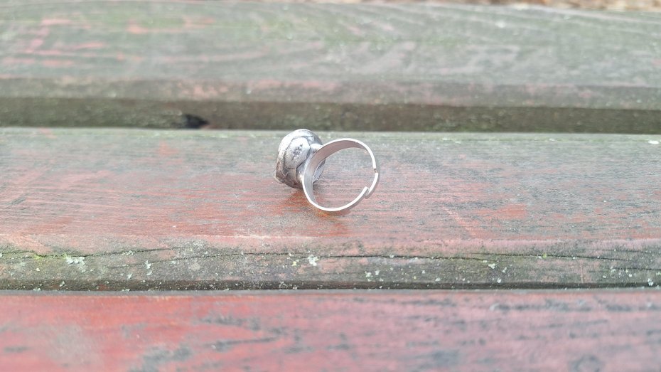 Pierścionek wykonany z miedzi, cyny i onyksu. Wymiary ok. 1.8 na 1.4 cm. Regulowany. Nie jest ciężki.