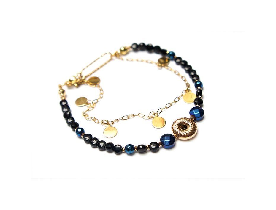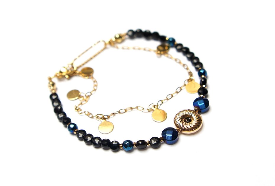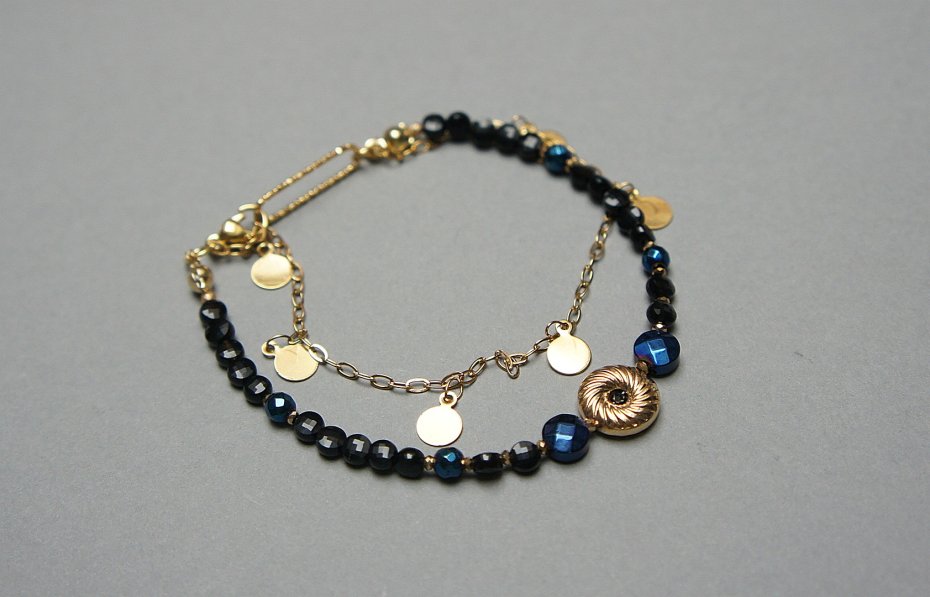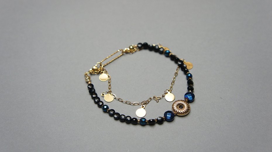 Delikatna bransoletka wykonana w całości ze stali szlachetnej pozłacanej oraz naturalnych, szlachetnych kamieni - fasetowane monetki onyksu [śr. 4mm], fasetowane kuleczki hematytu [4mm], fasetowane monetki hematytu [6mm], spinel fasetowany [2mm], złotego okręgu z hematytu [9mm] oraz przekładek z hematytu [1mm]. Całkowita długość bransoletki: ok. 19,3cm. Na życzenie możemy pomniejszyć lub powiększyć bransoletkę - wcześniej prosimy o kontakt.