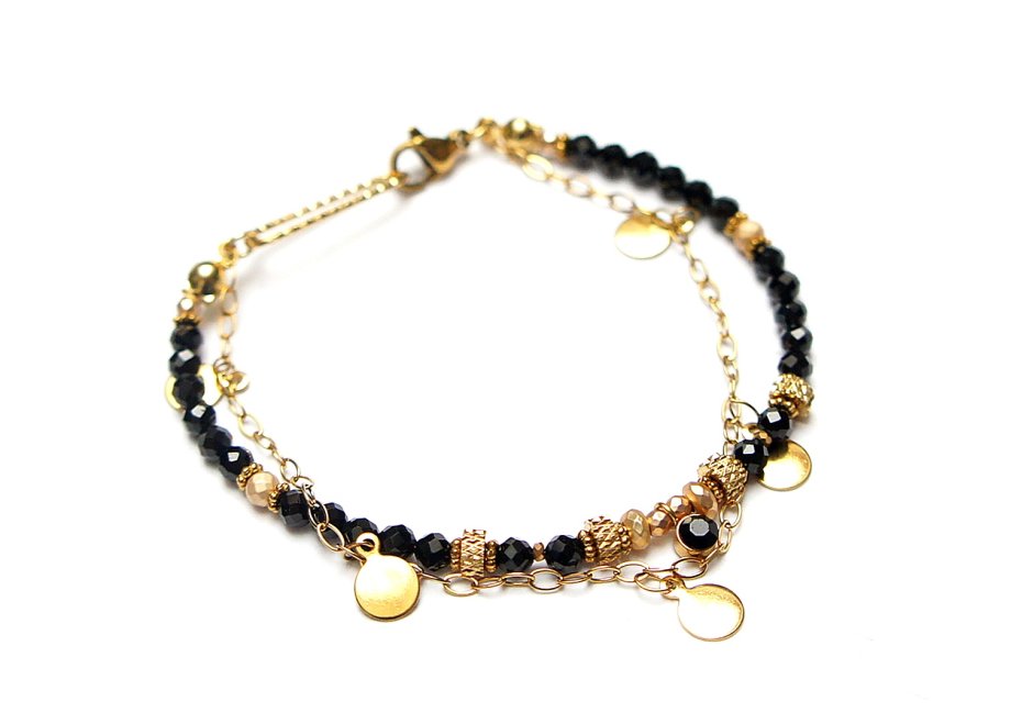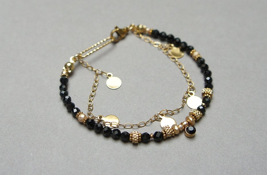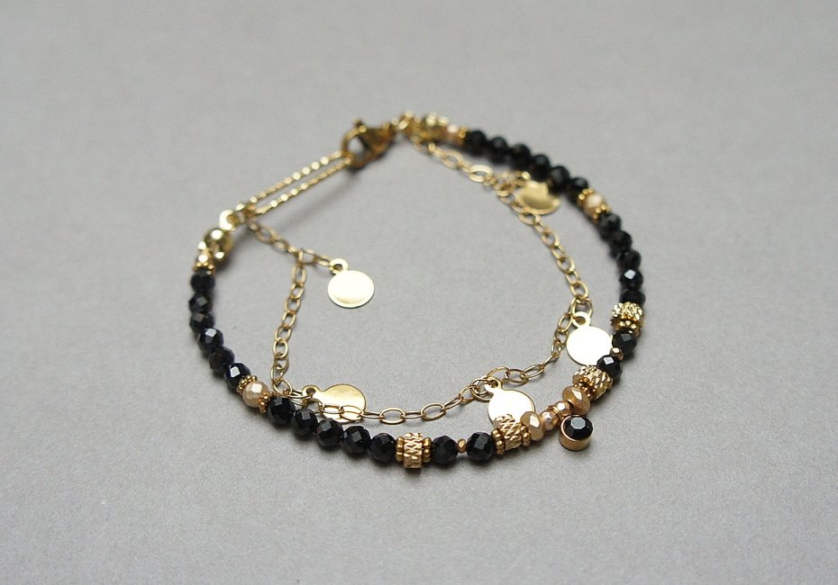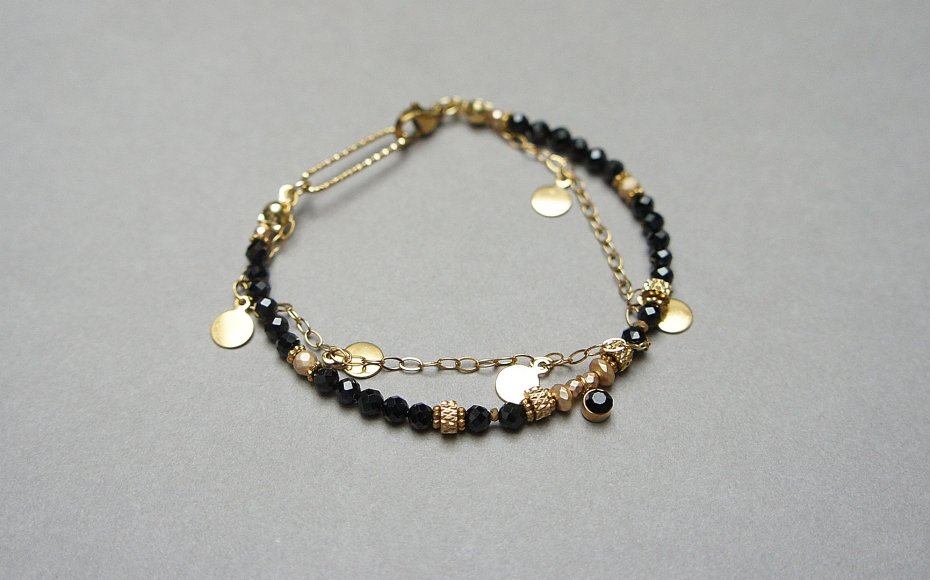 Delikatna bransoletka wykonana w całości ze stali szlachetnej pozłacanej oraz naturalnych, szlachetnych kamieni - fasetowany onyks [śr. 3mm], fasetowane kuleczki hematytu [3mm i 2mm], zawieszki z cyrkonią w okuciu oraz przekładek z hematytu [1mm]. Całkowita długość bransoletki: ok. 18,5cm. Na życzenie możemy pomniejszyć lub powiększyć bransoletkę - wcześniej prosimy o kontakt.