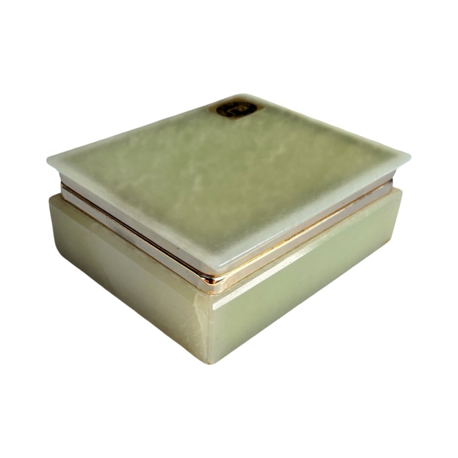 Piękna szkatułka wykonana z naturalnego onyksu – kamienia o subtelnym, zielonkawym zabarwieniu i charakterystycznym, niepowtarzalnym rysunku. Każdy egzemplarz ma unikalny układ żył i odcieni, dzięki czemu jest jedyny w swoim rodzaju.