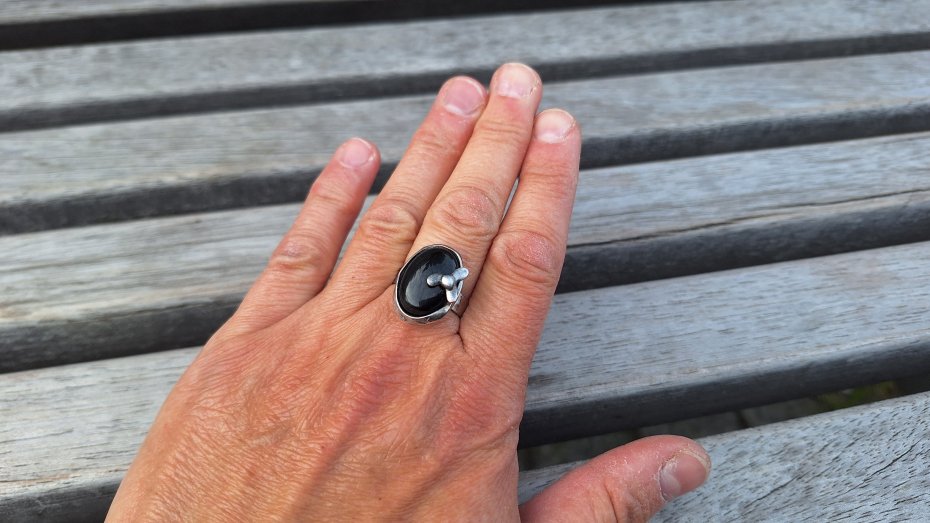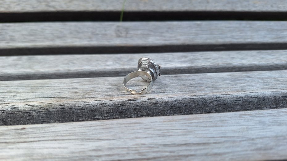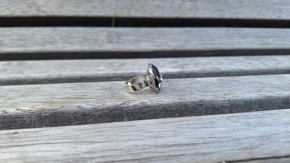 Pierścionek wykonany z miedzi, cyny i onyksu. Wymiary ok. 1.8 na 1.4 cm. Regulowany. Nie jest ciężki.