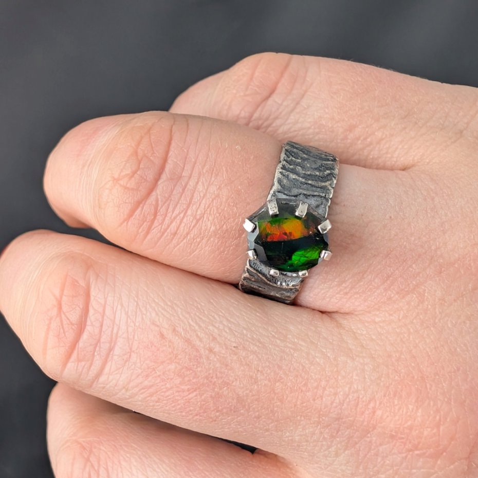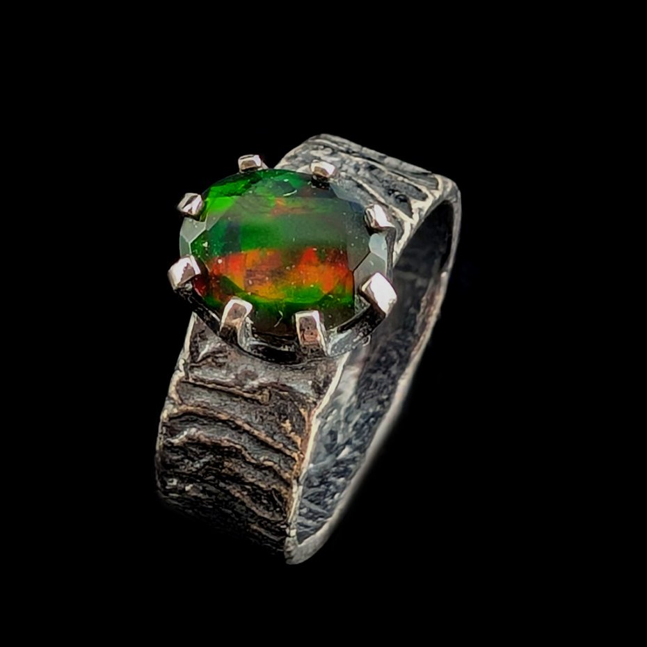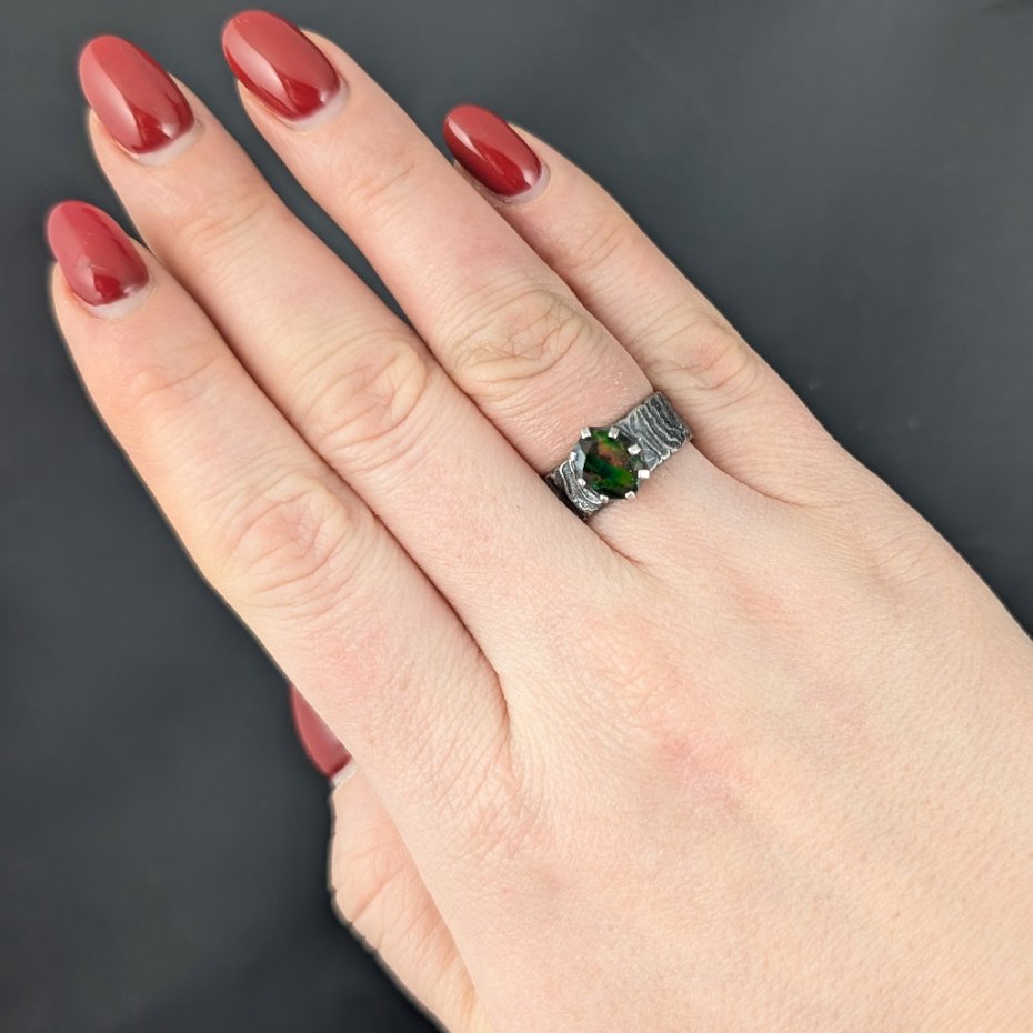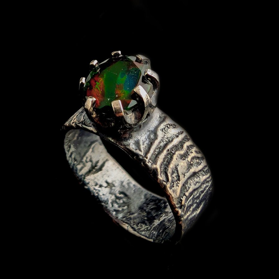 Pierścionek z przepięknym czarnym opalem etiopskim o niezwykłej opalizacji oprawionym w oksydowane srebro 925. Rozmiar jubilerski 16, mogę powiększyc na max 17. Obrączka ma 6 mm szerokości. Oprawa kamienia 10 x 8 mm. Waga 5,6 g.