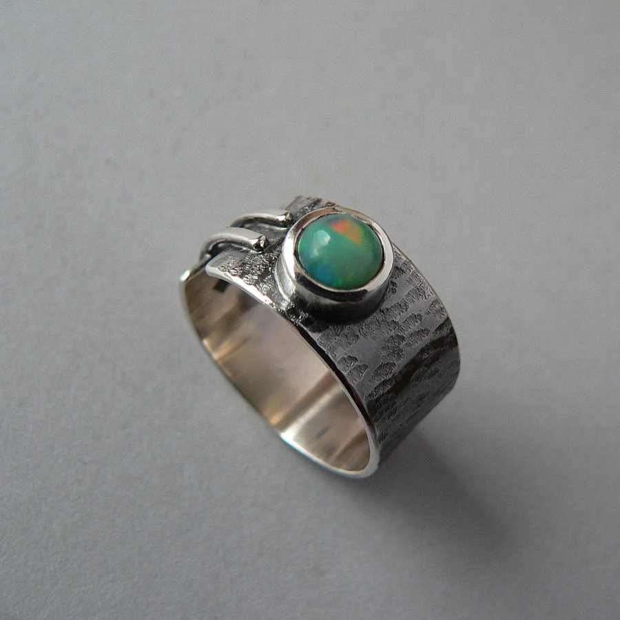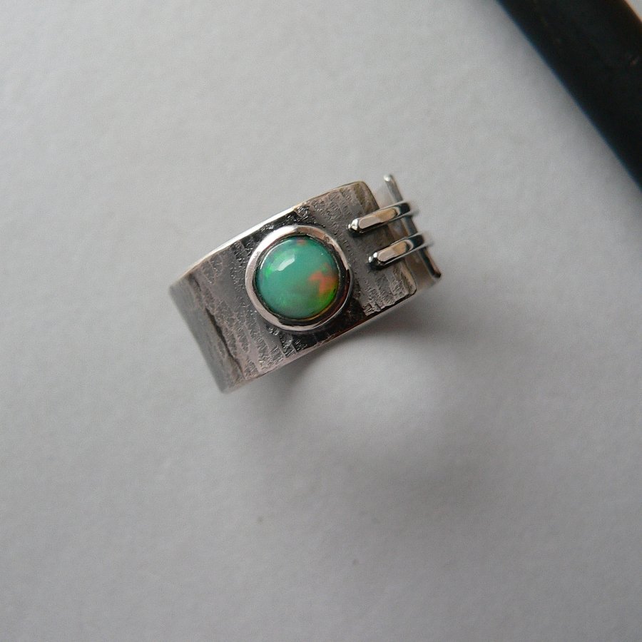 Asymetryczna obrączka wykonana ze srebra i opala etiopskiego. Powierzchnia srebra pokryta wyraźną fakturą, całość oksydowana, detale polerowane. Średnica opala 7 mm, barwa zielona z mgiełką i refleksami w czerwonym odcieniu. Szerokość obrączki 1 cm Obrączka pasuje na palec w rozmiarze 17-17,5