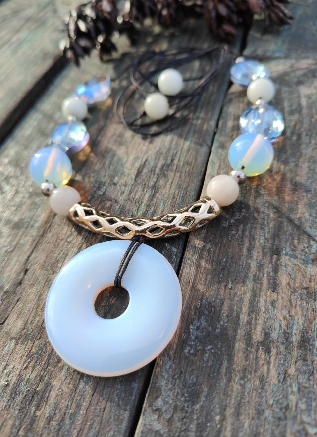 ,, opal na sznurku,, to utrzymane w kolorystyce bieli korale wykonane z opali, jadeitu i marmuru, oraz szklanych koralików. Całości korali dopełnia duża zawieszka. Kamienie zawieszone są na ozdobnym sznurku do samodzielnej regulacji.