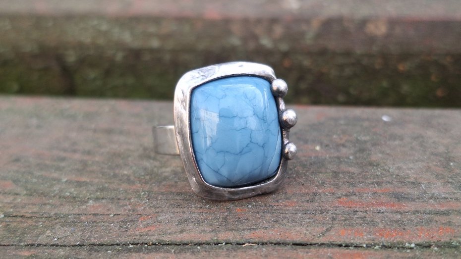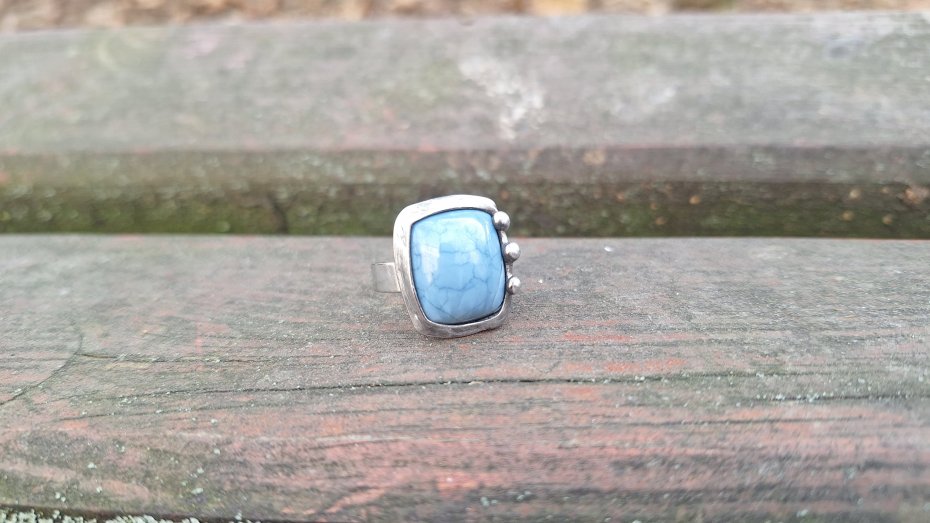 Pierścionek wykonany z miedzi, cyny i niebieskiego opala. Wymiary ok. 2 na 1.7 cm. Regulowany. Nie jest ciężki.
