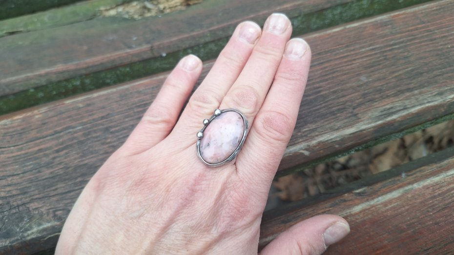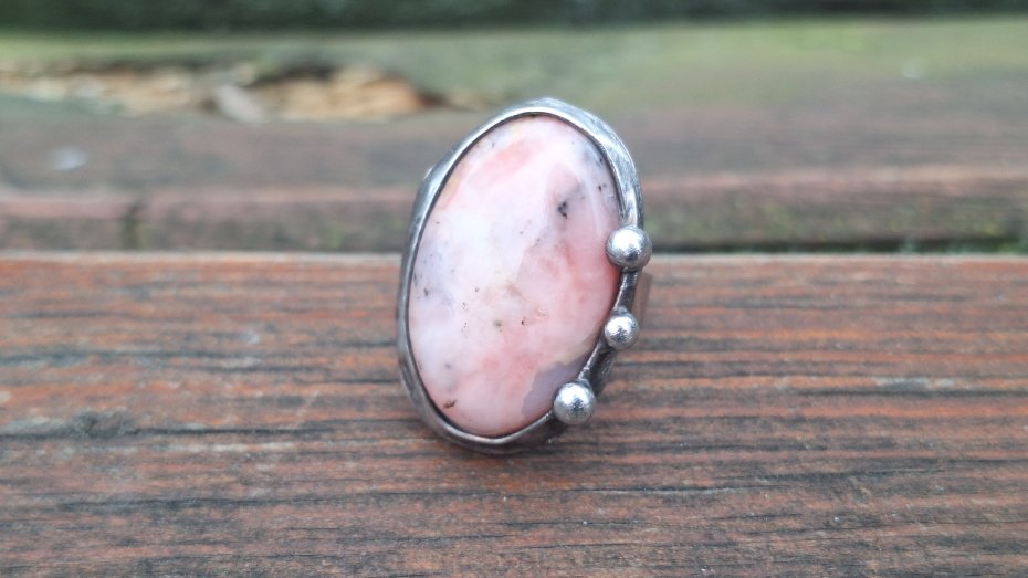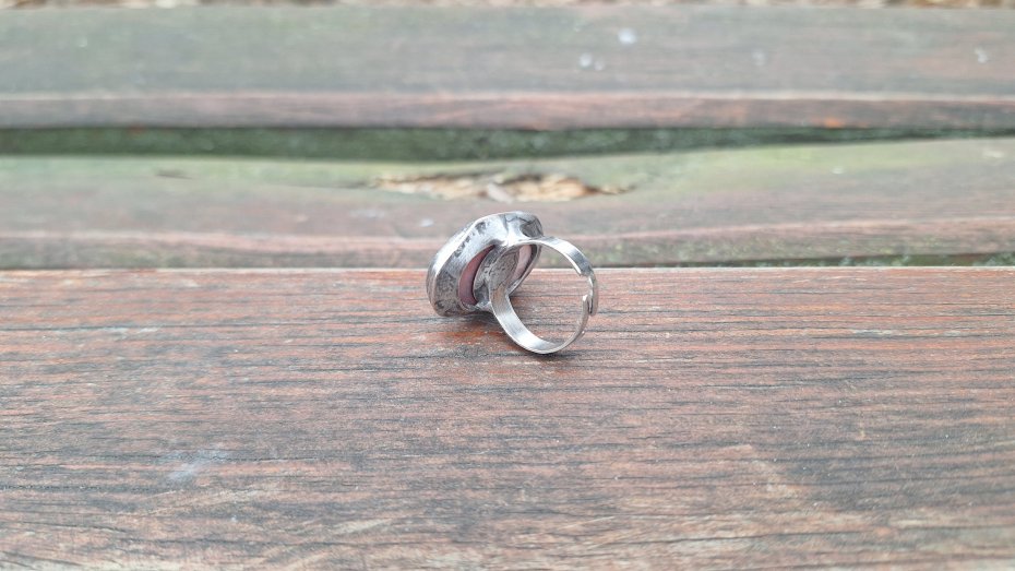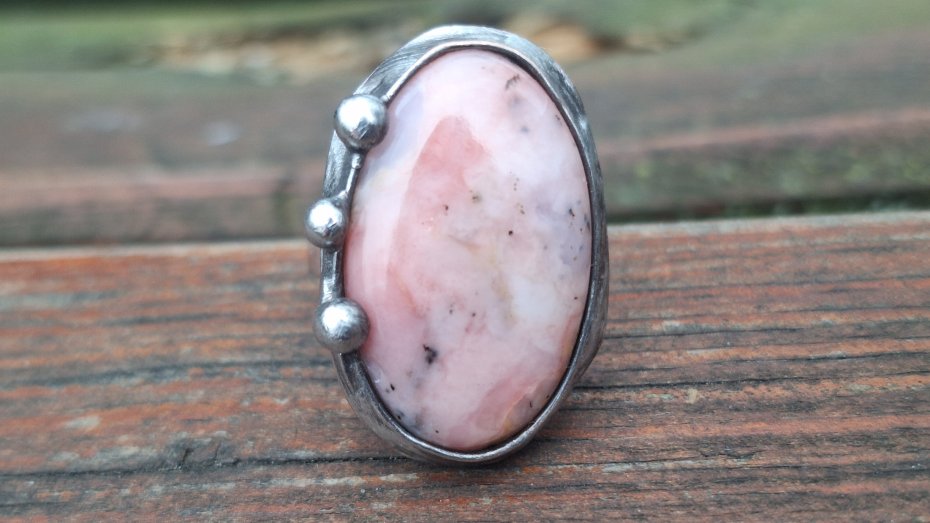 Pierścionek wykonany z miedzi, cyny i naturalnego różowego opala. Wymiary ok. 2.7 na 1.5 cm. Regulowany. Nie jest ciężki.