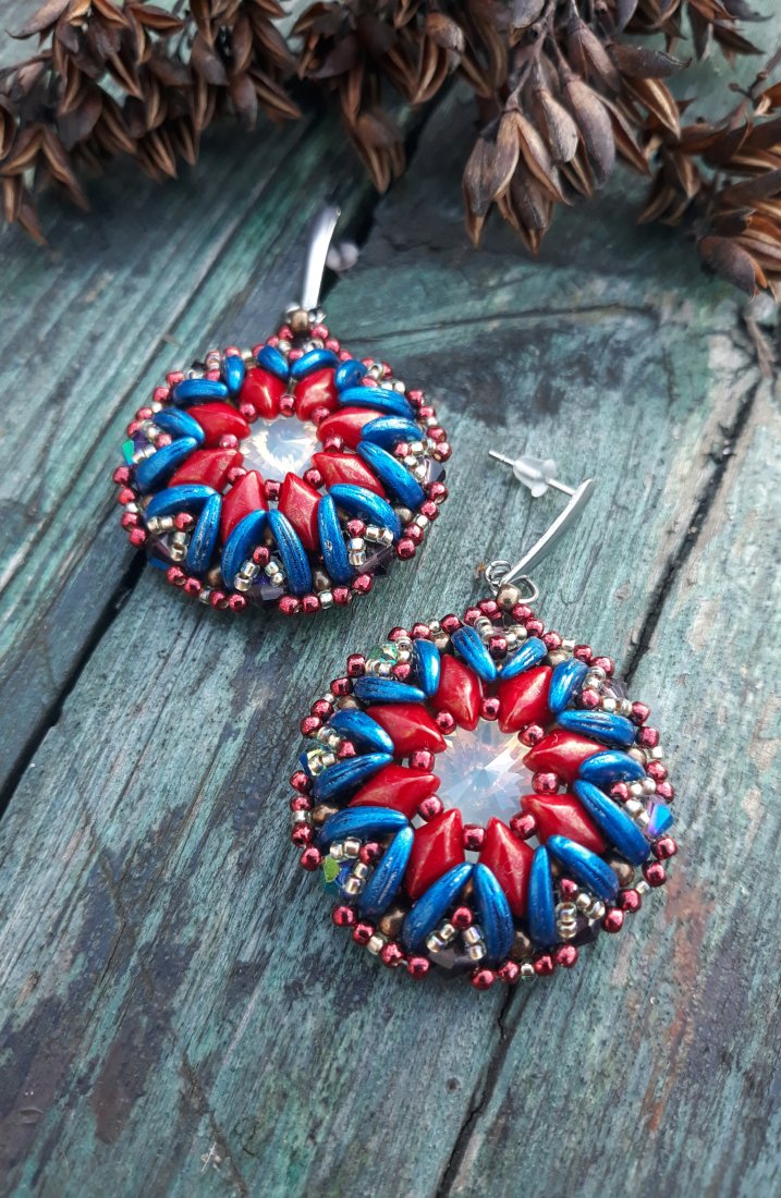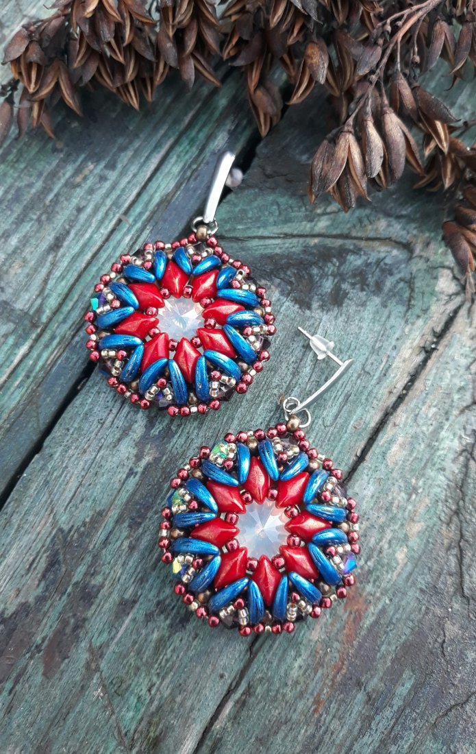 ,,opal w oplocie,, to niezwykle kobiece ażurowe kolczyki wykonane z opalowej rivoli oplecionej szklanymi koralikami i kryształkami w różnych odcieniach czerwieni, niebieskiego i złota. Kolczyki zawieszone są na ozdobnych biglach typu sztyft wykonanych ze stali szlachetnej.