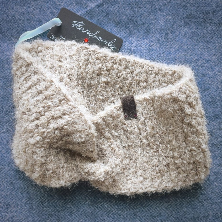 Opaska w kolorze beżowym wykonana z połączenia dwóch włóczek: 100% alpaka i alpaka bouclè. Posiada zamszową naszywkę w kolorze czekolady, którą można opcjonalnie usunąć.