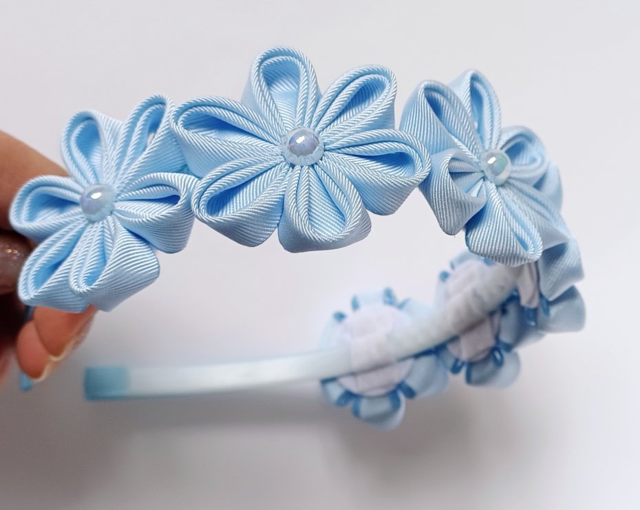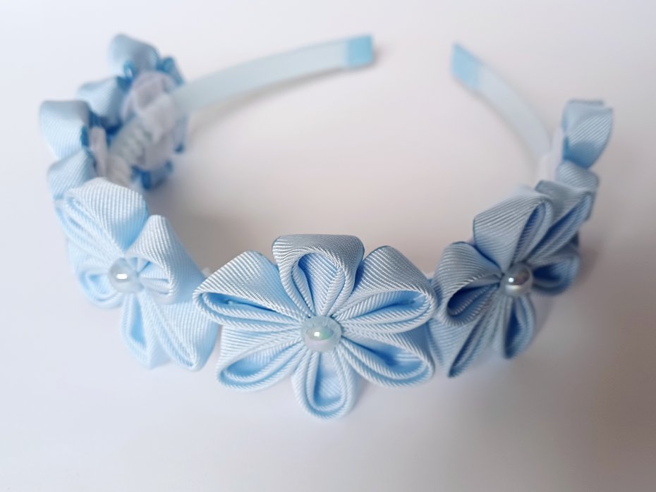 Kwiaty na opasce wykonuję z tasiemek tradycyjną japońską techniką tsunami i były częścią ozdobnych szpilek - kanzashi. Dzisiaj ta technika służy mi do tworzenia współczesnych ozdób na włosy twojego dziecka.