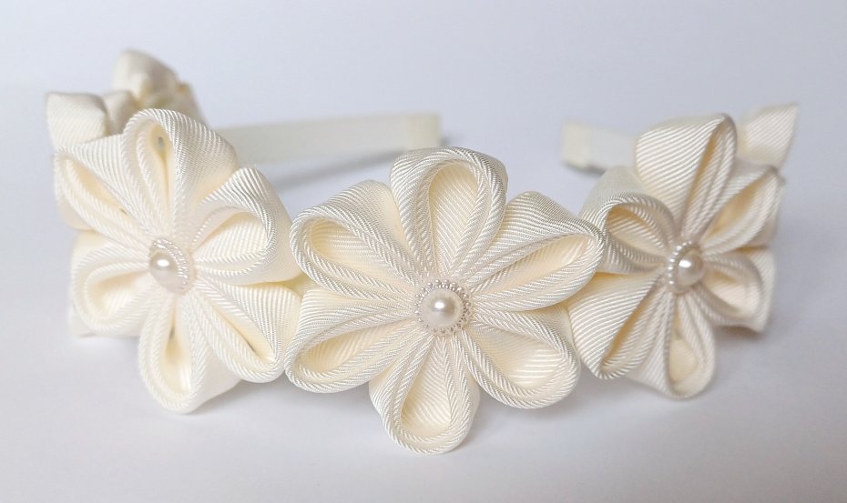 Kwiaty na opasce wykonuję z tasiemek tradycyjną japońską techniką tsumami i były częścią ozdobnych szpilek - kanzashi. Dzisiaj ta technika służy mi do tworzenia współczesnych ozdób na włosy twojego dziecka.