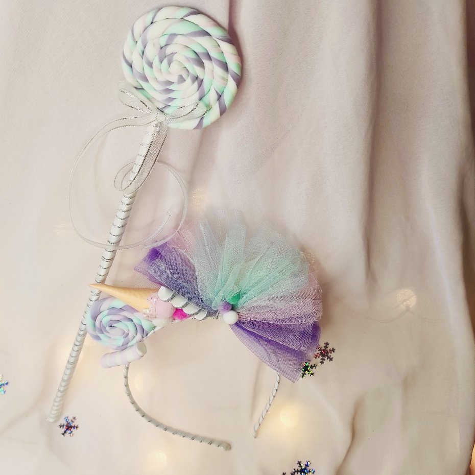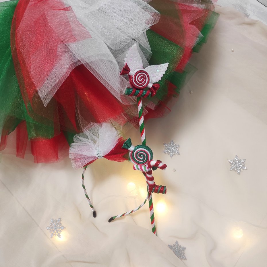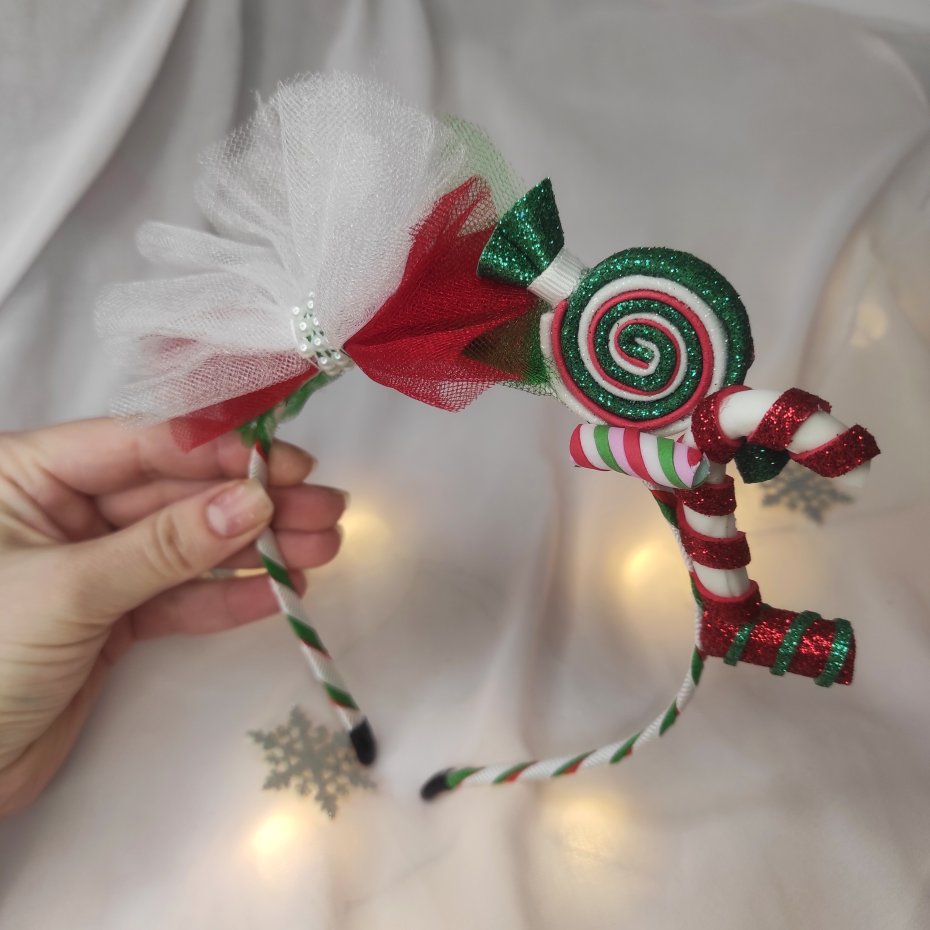 Świąteczna ozdoba do włosów z cukierkami — idealna do bożonarodzeniowych stylizacji, sesji zdjęciowych lub przedstawień.