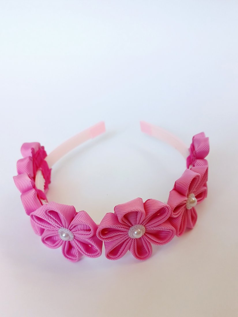 W tym wariancie w kolorze fuksji. Środek biała półperełka z plastiku. Od strony głowy każdy kwiat jest podklejony filcem, tak aby zapewnić komfort w trakcie noszenia - dzięki temu też ząbki nie drażnią wrażliwej skóry dzieci.