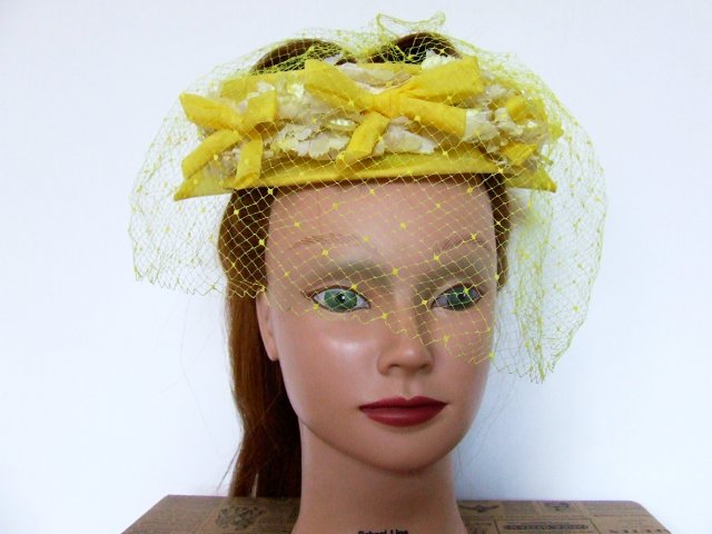 Nakrycie głowy, w kolorze żółtym, ozdobione kokardkami i kwiatkami w kolorze kremowym, całość pokryta woalką.