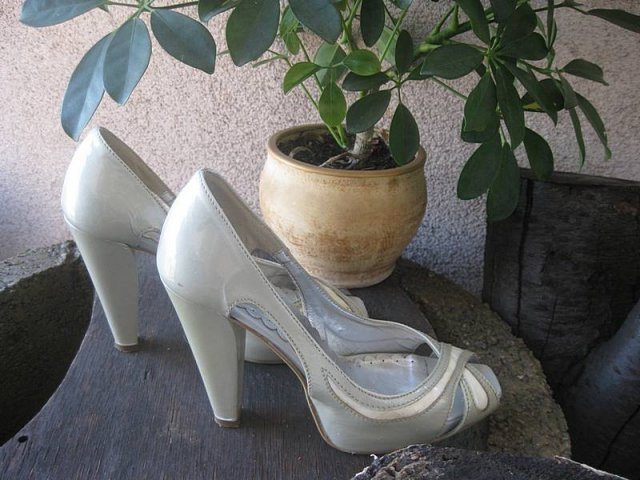 Śliczne włoskie szpilki lakierki. Wg informacji na bucie (vera pelle) ze skóry, ale nie wiem czy całe czy jakaś część. Kolor jasny popielaty, jakby pomieszany z beżem. Niewielkie ślady użytkowania, na wstawkach ecru. Rozmiar 35, ale to raczej 36. Nie potrafię nic powiedzieć na temat ich stabilności i wygody, ponieważ noszę 38.