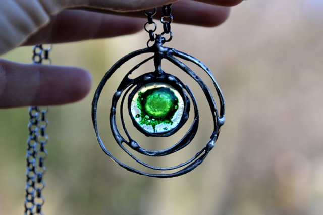 Subtelny wisior z ze szkiełkiem pełnym zielonych bąbelków. Średnica wisiorka to ok. 5 cm. Szkło oprawione w ekologiczną cynę stylizowaną na stare srebro zawieszony na długim łańcuchu. Biżuteria w 100% wykonana ręcznie, poszczególne sztuki mogą się minimalnie różnić.