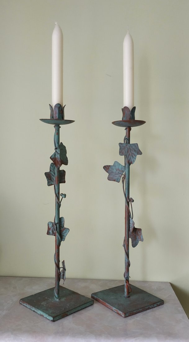 ciężkawe, stabilne. oplecione listkami bluszczu. kolor miedziano zielonkawy.