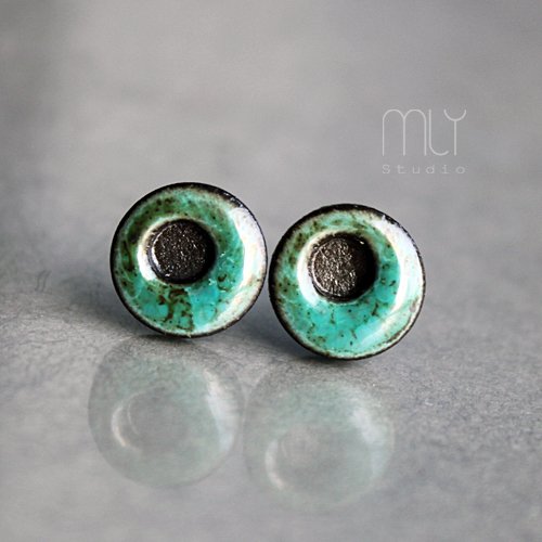 Ceramiczne, lekko nieregularne kolczyki w formie sztyftów, ręcznie wykonane z delikatnej czekoladowobrązowej gliny kamionkowej, jednostronnie szkliwione efektownym zielonym błyszczącym szkliwem z efektem plamek, na antyalergicznych sztyftach w kolorze srebrnym.Średnica ok. 11mm. Polecam