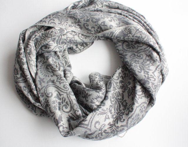Miękki szal bardzo delikatnie oprószony srebrem. Materiał to wiskoza.