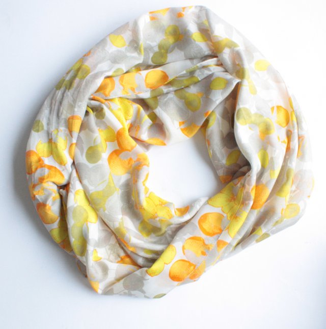 Miękki, duży szal w optymistyczne wzory. Materiał to prawdopodobnie wiskoza lub bawełna.