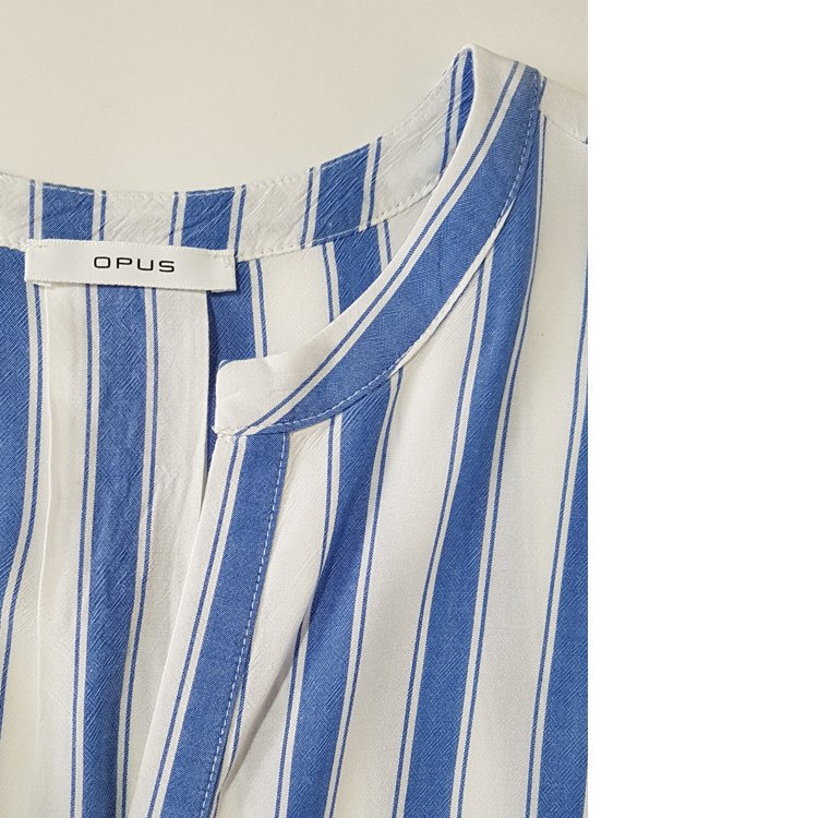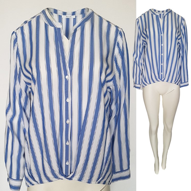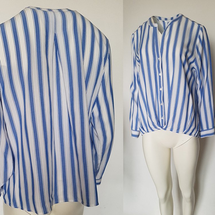 Bluzka w pasy z przyjemnej przewiewnej tkaniny, zapinana na guziki, dół ciekawie drapowany zakładkami, na plecach kontrafałda. Super na co dzień do letnich zestawów.