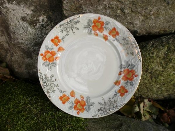 Porcelanowy, śniadaniowy talerzyk w kolorze ecru z pomarańczowymi, pięknymi kwiatami i złotymi, drobniutkimi kwiatuszkami w girlandach na brzegu oraz wypukłym wzorem. Uroczy i bardzo romantyczny.