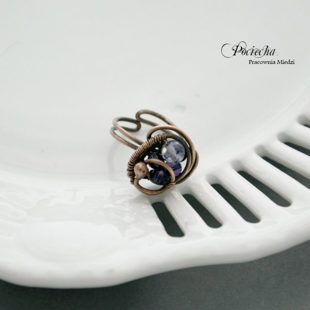 Pierścionek stworzony ręcznie z miedzi jubilerskiej. Ozdobiony licznymi splotami, szklanymi kuleczkami oraz kuleczką fluorytu . Kamienie zostały misternie oplecione miedzią. Pierścionek ma uniwersalny rozmiar. Miedź została spatynowana i wypolerowana. Korona pierścionka ma wymiary ok. 1,8 x 2 cm. Projekt autorski. Polecam.