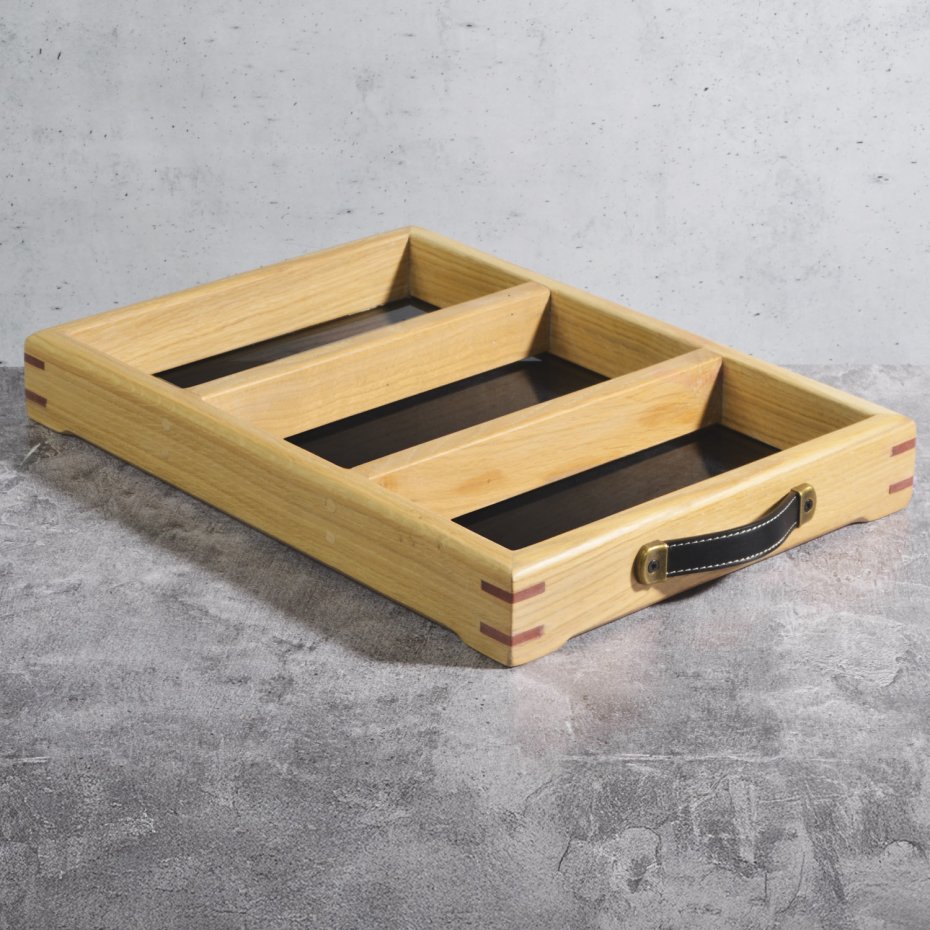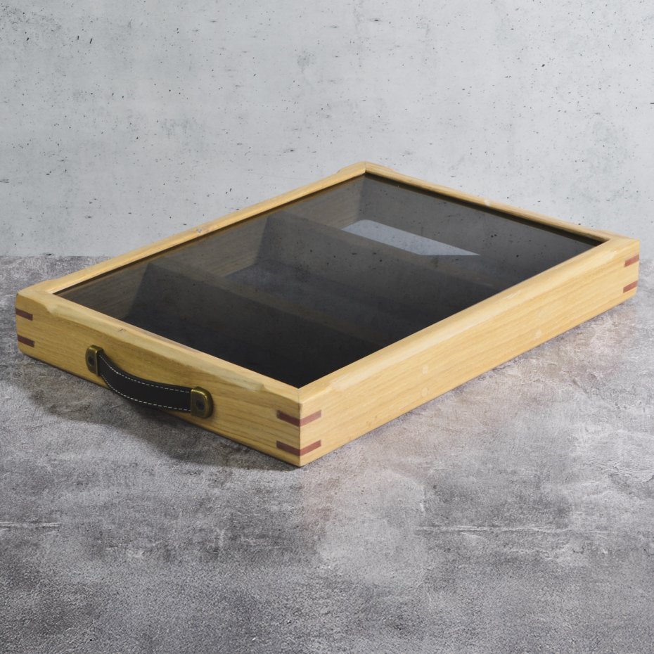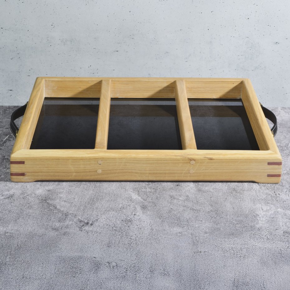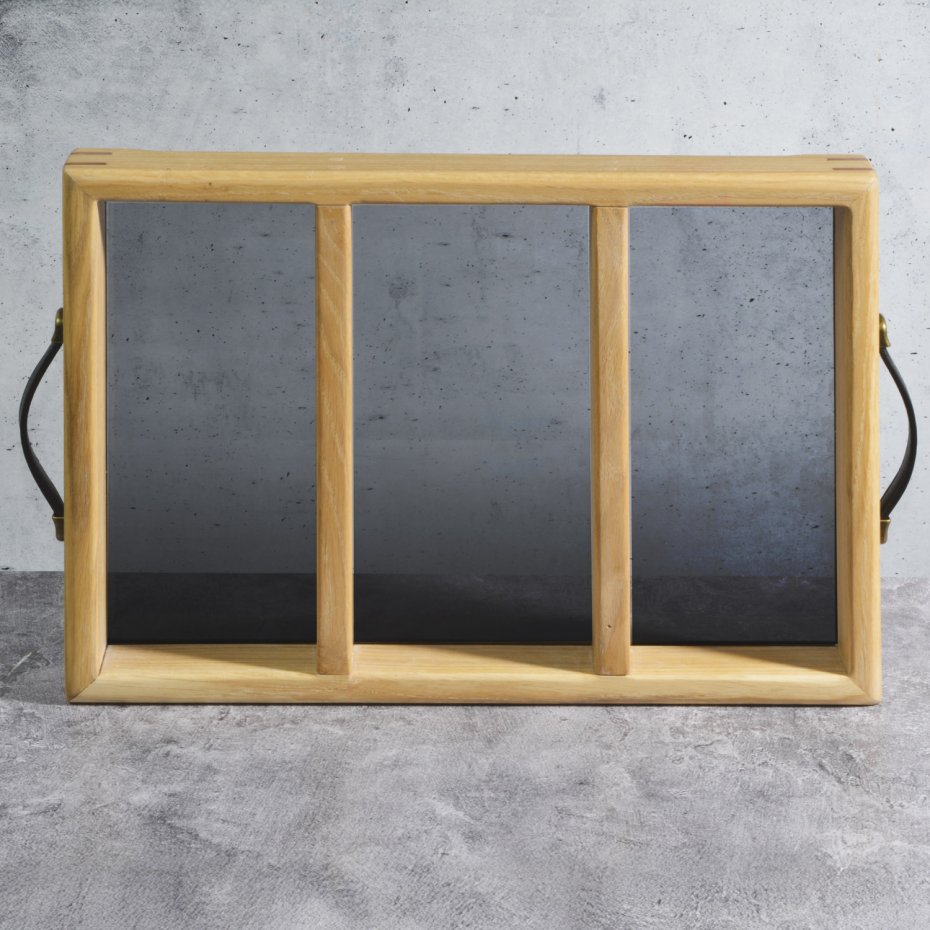 Lite drewno dębowe tworzy solidną, stabilną formę. Naturalny rysunek słojów i ręczne wykończenie podkreślają materiał, który z czasem nabiera jeszcze więcej charakteru. Dno z szarego (grafitowego) szkła hartowanego delikatnie przyciemnia odbicie – tworzy spokojne, nasycone tło dla przedmiotów.