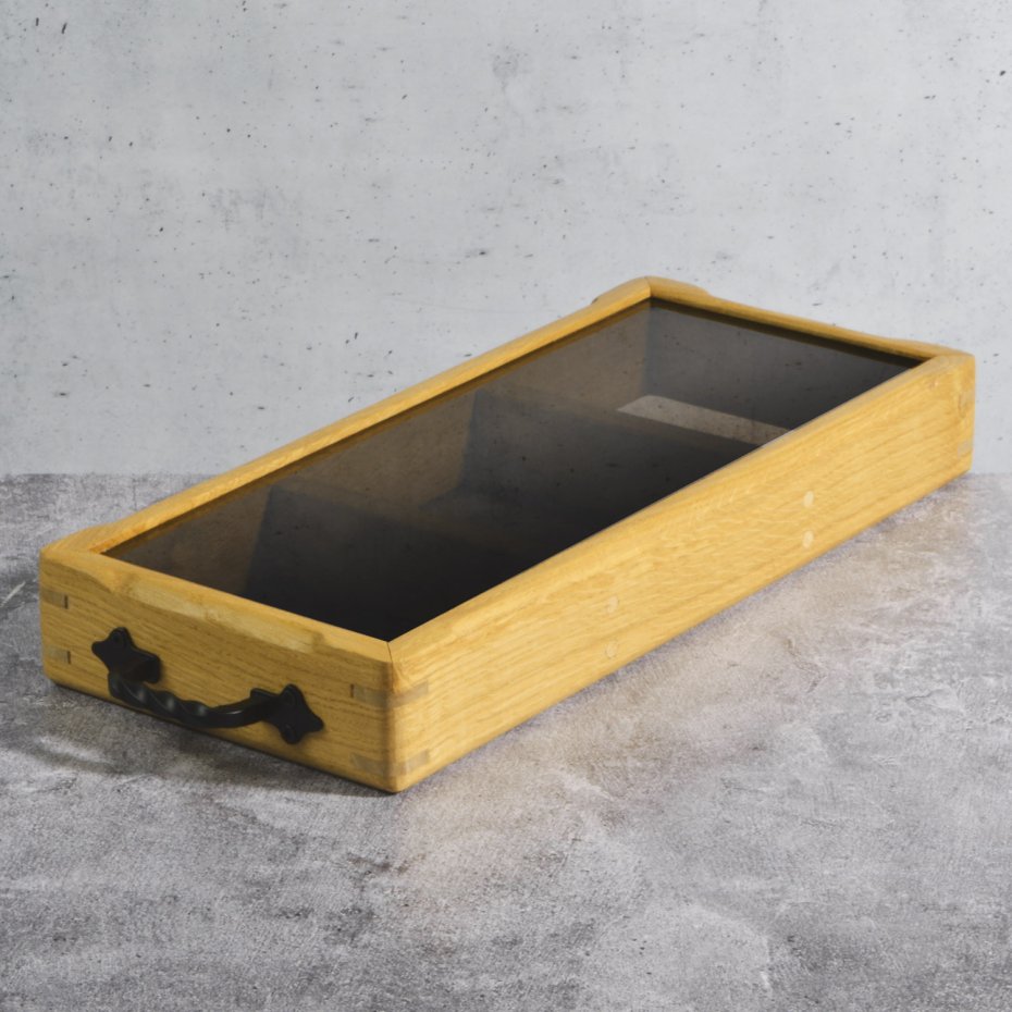 Lite drewno dębowe tworzy solidną, naturalną ramę. Rysunek słojów prowadzi wzrok, a ręczne wykończenie wydobywa głębię materiału. Dno z grafitowego szkła hartowanego wprowadza subtelne odbicie i kontrast – to tło, które pracuje razem z przedmiotami.