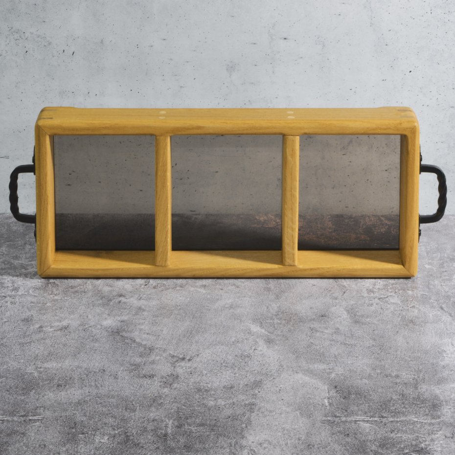 Lite drewno dębowe tworzy solidną, naturalną ramę. Rysunek słojów prowadzi wzrok, a ręczne wykończenie wydobywa głębię materiału. Dno z grafitowego szkła hartowanego wprowadza subtelne odbicie i kontrast – to tło, które pracuje razem z przedmiotami.