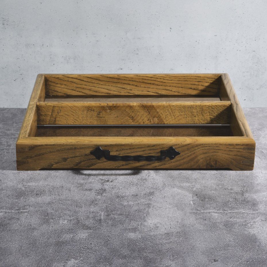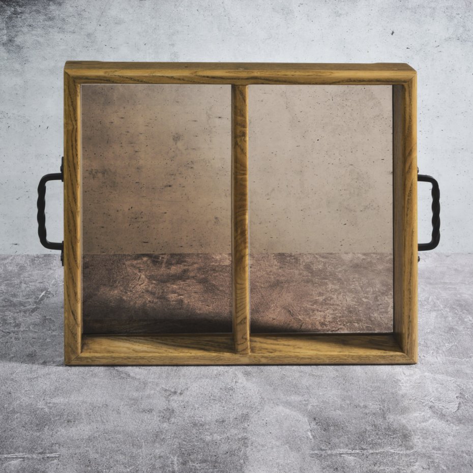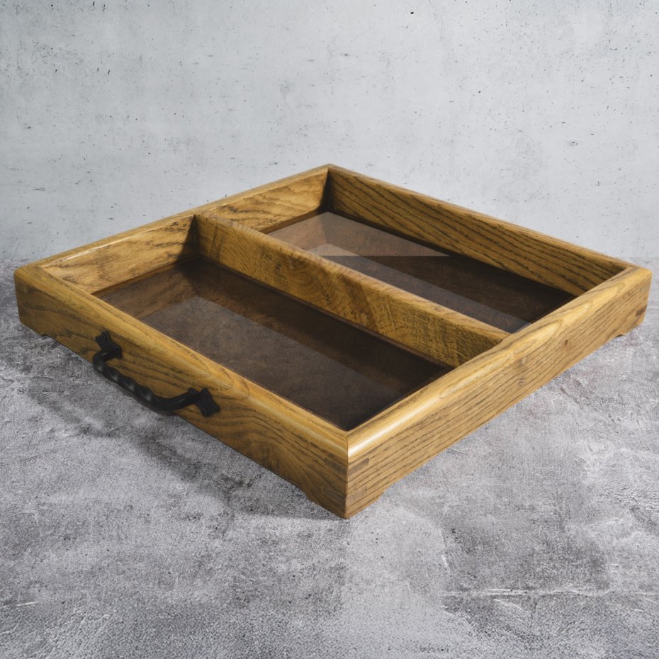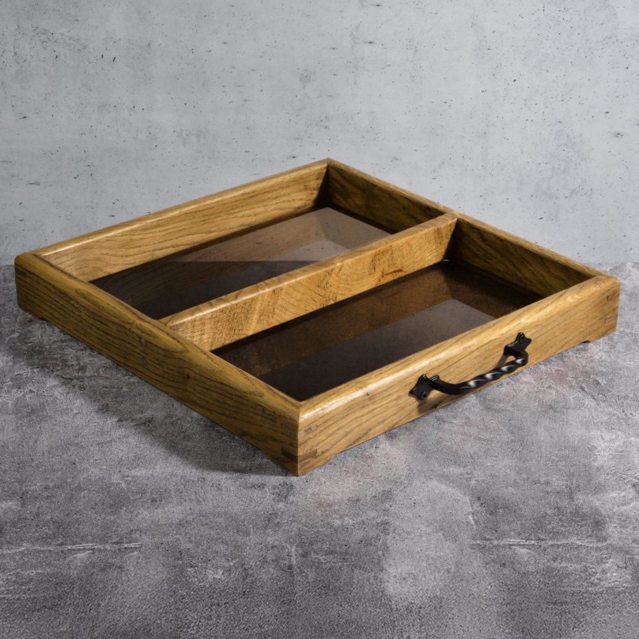 Połączenie naturalnego dębu i przydymionego szkła tworzy przedmiot, który porządkuje przestrzeń, nie narzucając się jej formą. Organizer powstał jako rozwinięcie klasycznej tacy – z myślą o tych, którzy oprócz estetyki szukają także funkcjonalnego podziału przestrzeni.