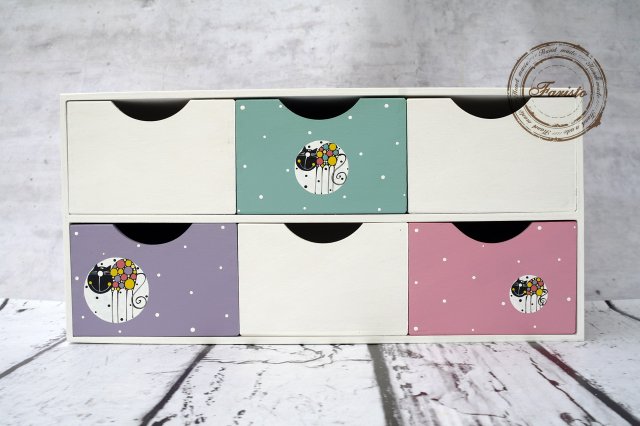 Półeczka z sześcioma szufladkami na wszystkie drobiazgi, które nie wiemy gdzie schować. Całość pomalowana ręcznie farbami akrylowymi(ekologicznymi). Istnieje możliwość wyboru zestawu kolorów innego niż na zdjęciu.