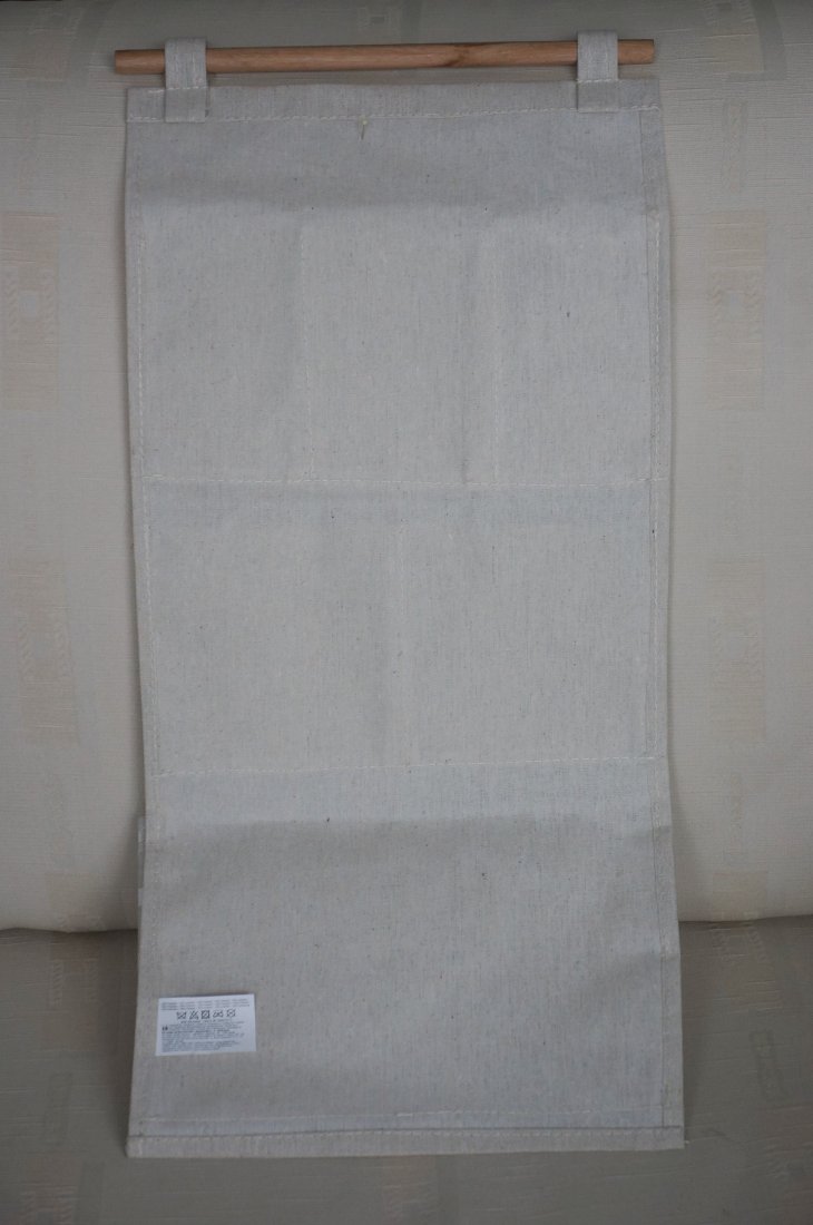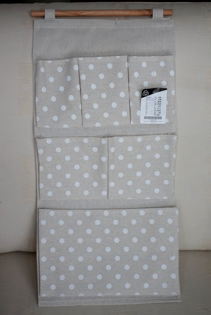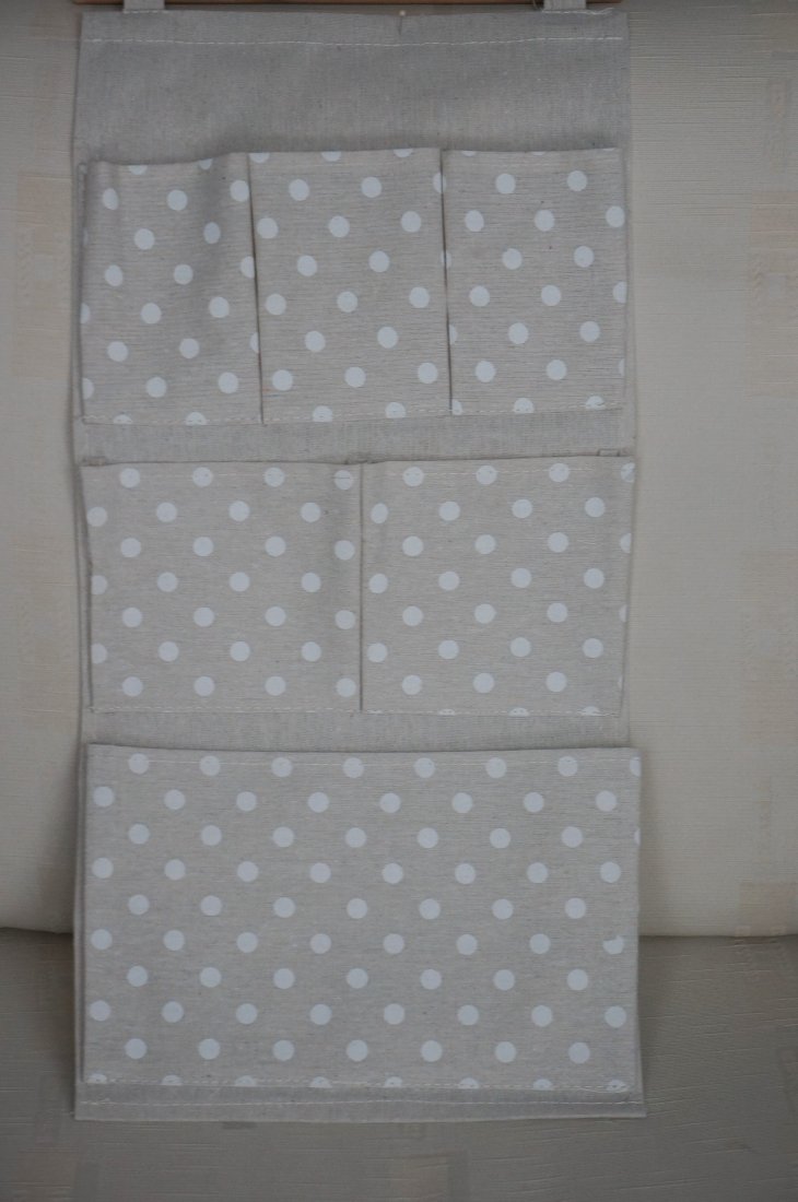 Tekstylny, wiszący organizer z kieszeniami w beżowym kolorze z białymi kropkami. Posiada 6 przegródek na różnego rodzaju akcesoria i drobiazgi. Przedmiot nowy. Stan bardzo dobry.