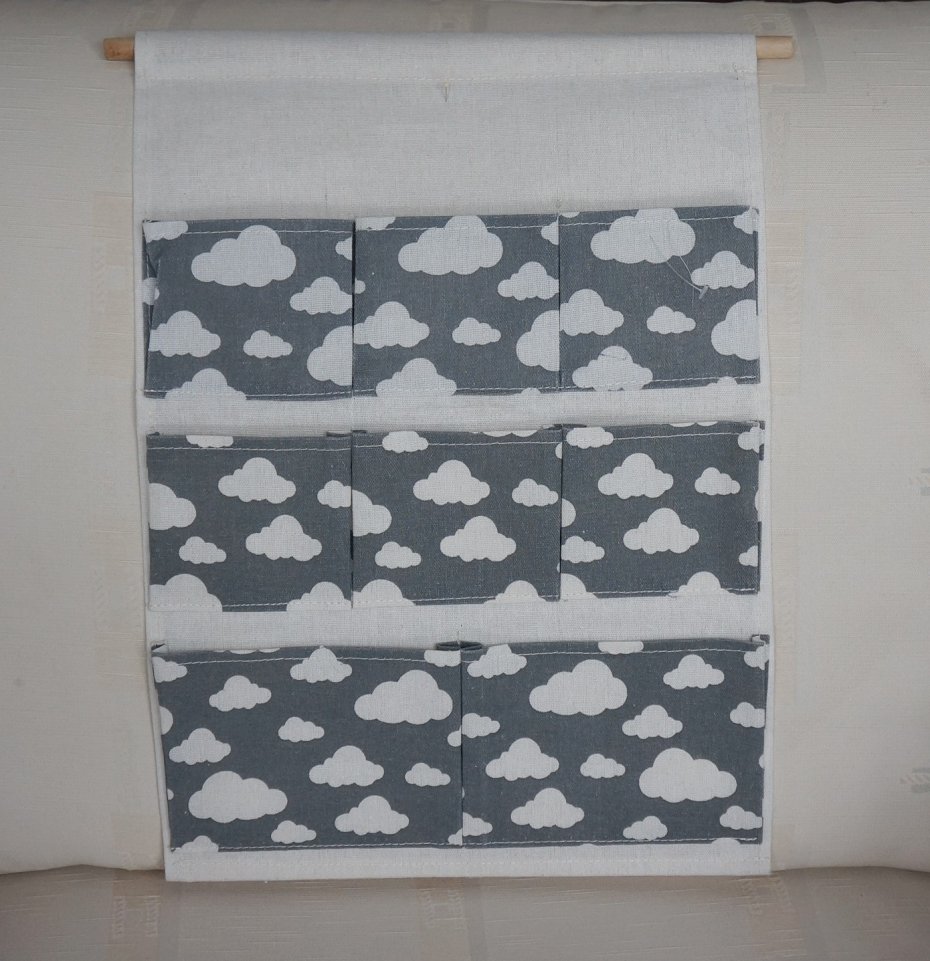 Tekstylny, wiszący organizer z kieszeniami w szarym kolorze z białymi obłoczkami. Posiada 8 przegródek na różnego rodzaju akcesoria i drobiazgi. Przedmiot nowy. Stan bardzo dobry.