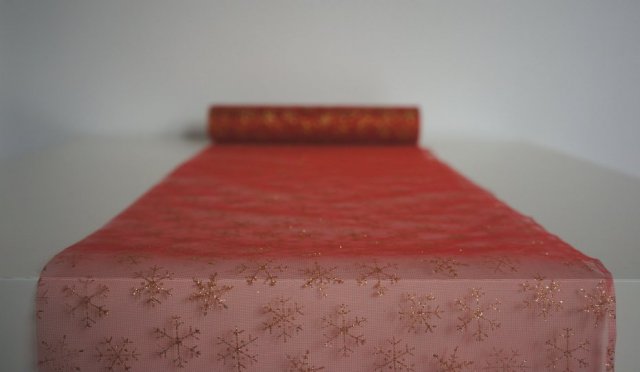 Organza - cienka, przejrzysta tkanina. Kolor czerwony w złote wzorek. Bardzo ładnie będzie się prezentować na stole. Produkt nowy, oryginalnie zapakowany. Gorąco polecam.