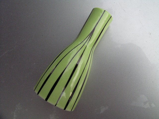 Porcelanowy Wazonik sygnowany X K C W G i numerycznie 11841. Ręcznie malowany typowy dla Designu lat 60ych wzór cienkich czarnych kresek. Bardzo niespotykana to rzecz. Soczyste zielone tło na satynowo wykończone.Wewnątrz biel.
