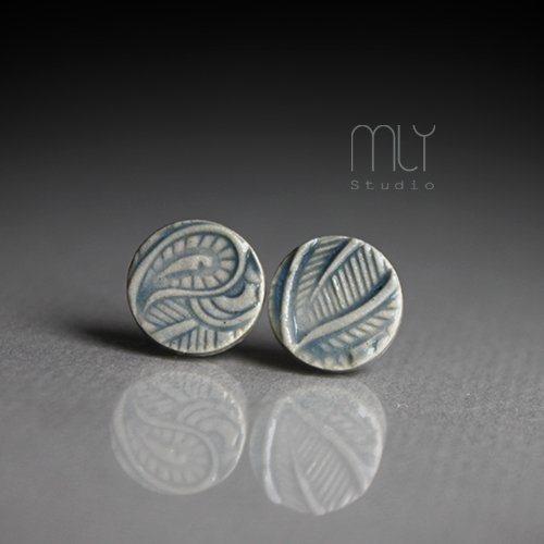 Ceramiczne okrągłe kolczyki w formie sztyftów, ręcznie wykonane z delikatnej jasnobeżowej gliny kamionkowej, dekorowane wgłębnym motywem roślinnym, jednostronnie szkliwione mieszanką zielonkawo szarego i błękitnego szkliwa, na sztyftach w kolorze srebrnym.Średnica ok. 11mm.. Polecam