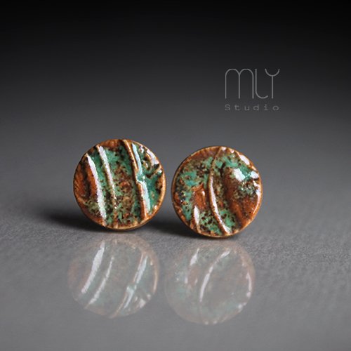 Ceramiczne okrągłe kolczyki w formie sztyftów, ręcznie wykonane z delikatnej jasnobeżowej gliny kamionkowej, dekorowane wgłębnym reliefem, szkliwione rudobrązowym i zielonym szkliwem, na sztyftach w kolorze srebrnym.Średnica ok. 11mm.. Polecam